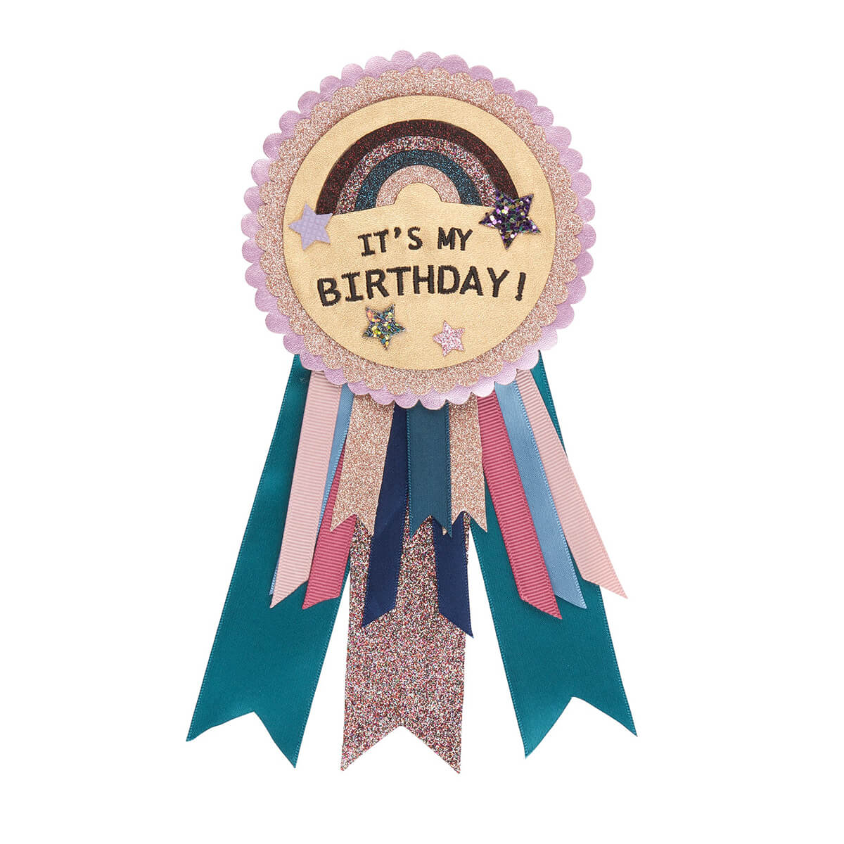 It's My Birthday rosette brooch by Mimi & Lula. Hip, hip, hooray! Your little one will feel extra special on their big day with this fabulous 'It's my Birthday' rosette. Better yet, it can be used again and again, year after year. Features a shimmering appliqué rainbow and stars atop layers of scalloped trim glitter and metallic leatherette fabric. Finished with layers of satin, grosgrain and glitter ribbons in an array of rainbow colours.