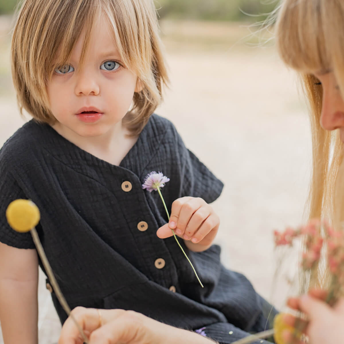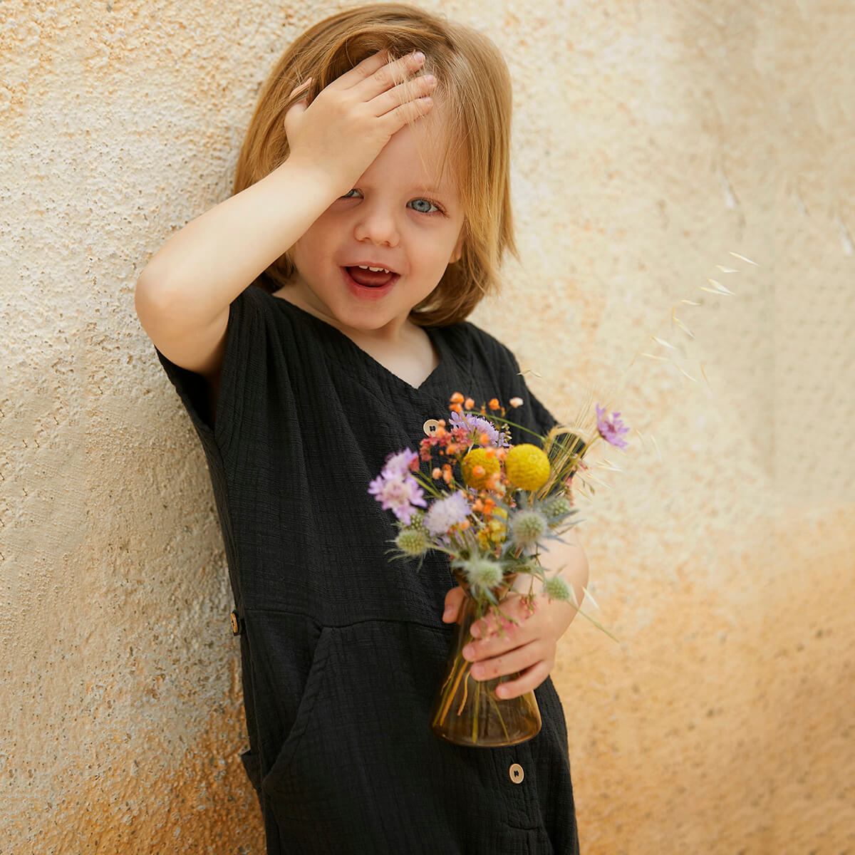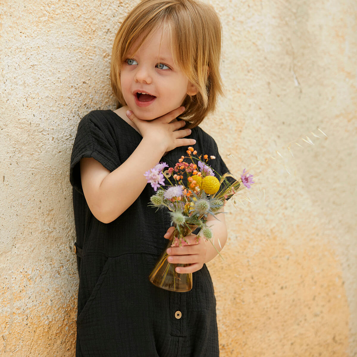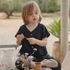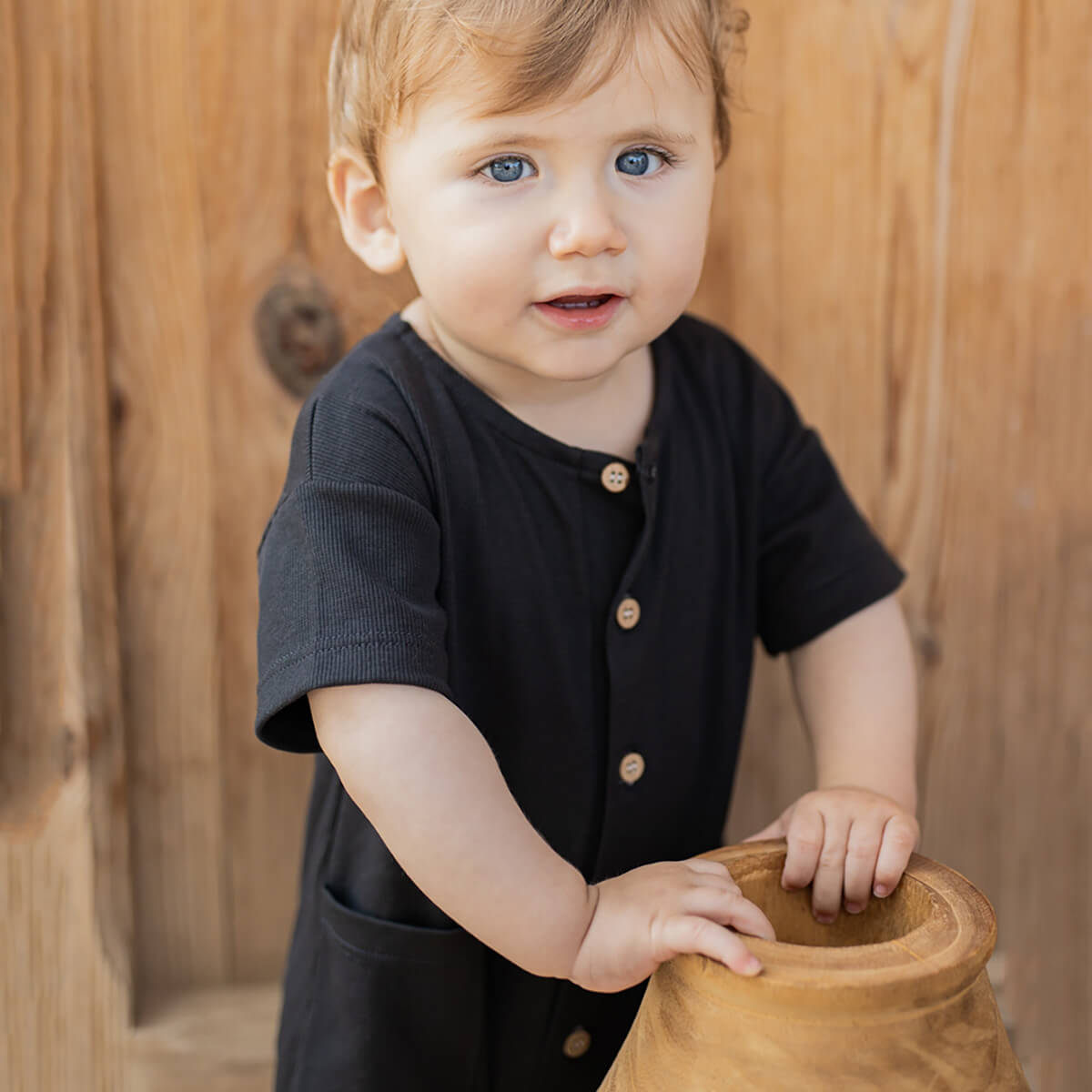 Adriano Short Sleeve Overall by 1+ in the Family. Sweet baby overall in a rustic double face fabric. With wooden button fastenings and pockets.