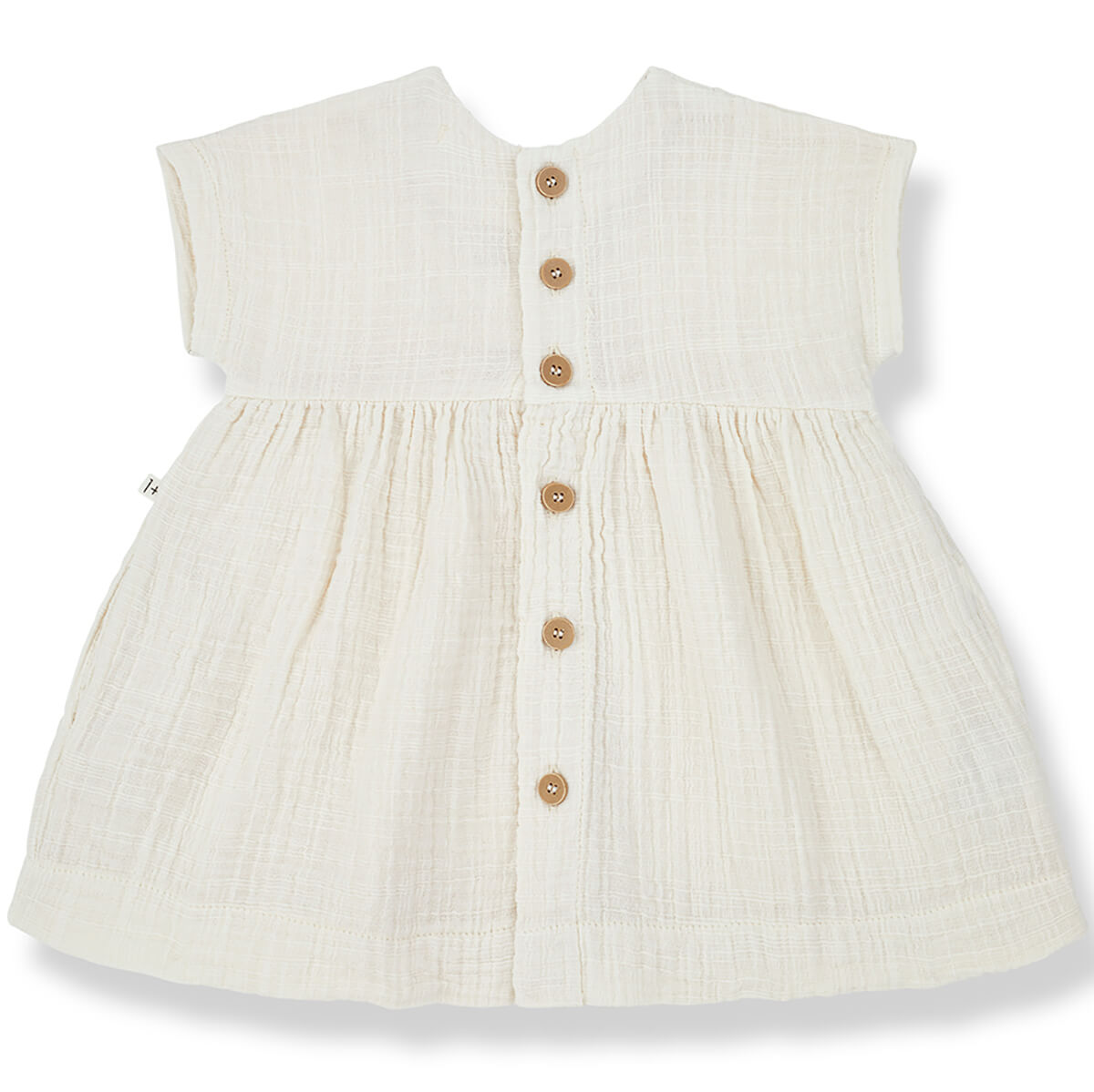 Alberta Dress by 1+ in the Family. Sweet baby dress in a rustic double face fabric. With wooden button fastenings on the back.
