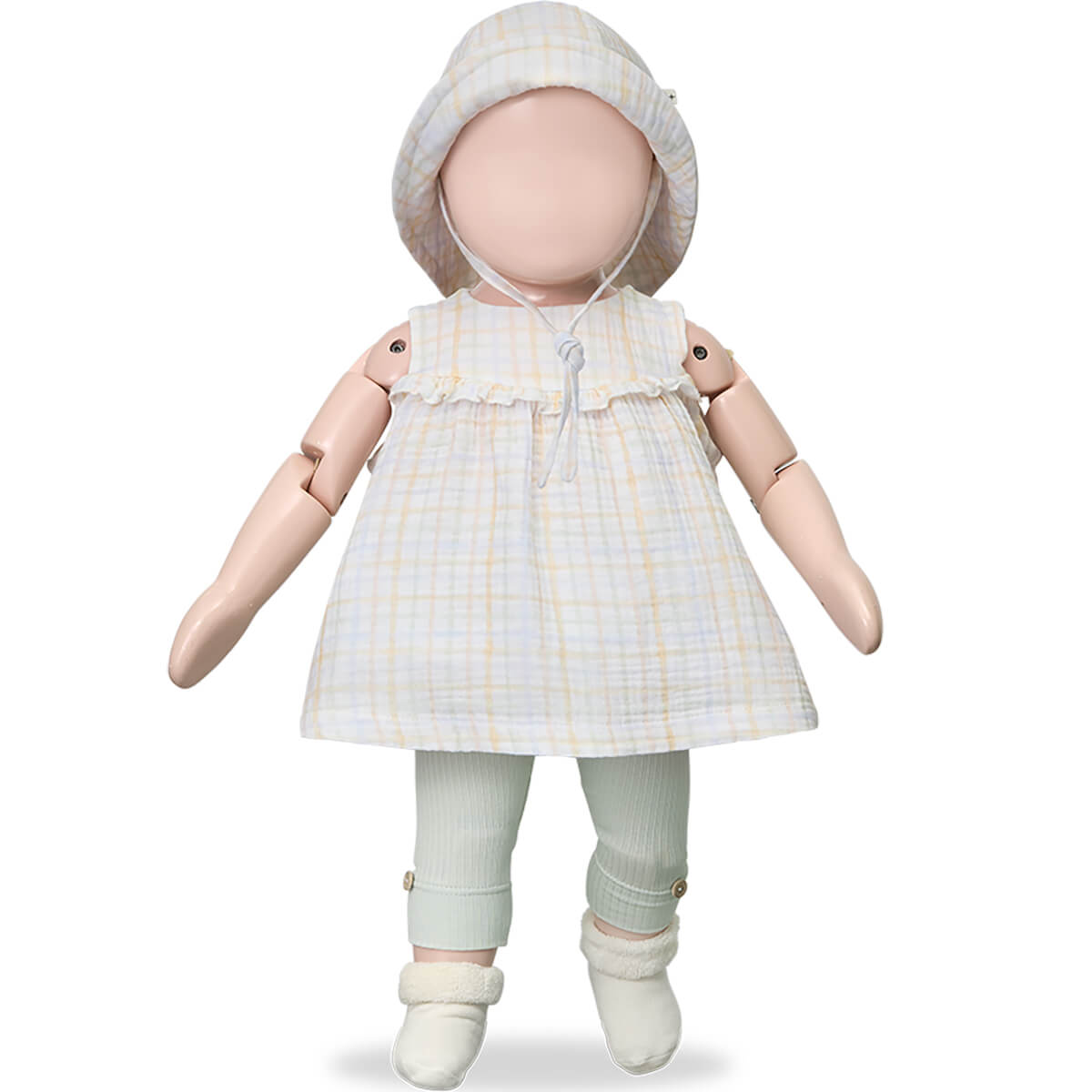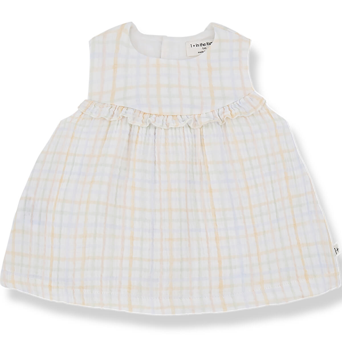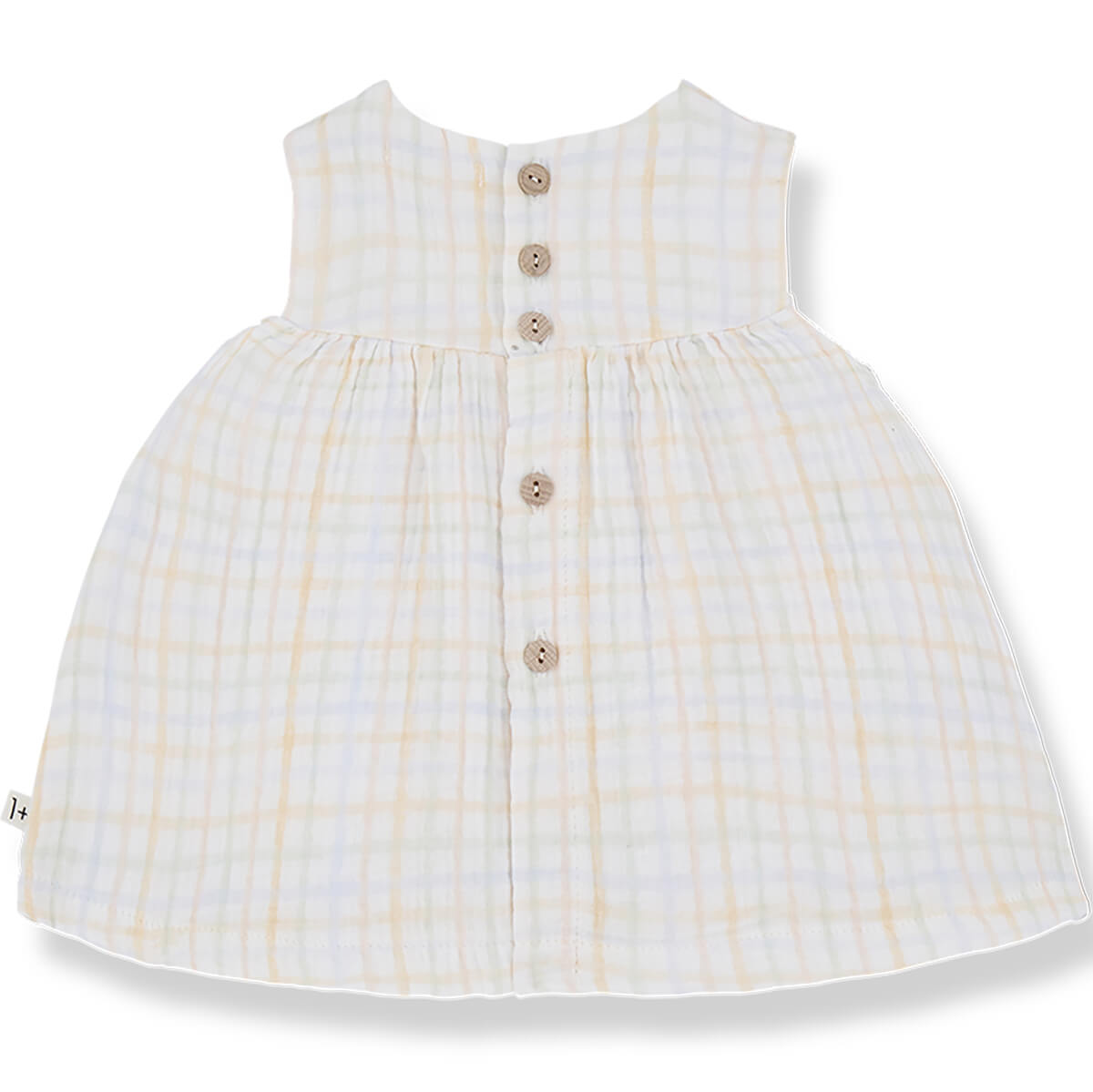 Laia Dress by 1+ in the Family. Sleeveless baby dress in a soft check muslin fabric with wooden buttons.