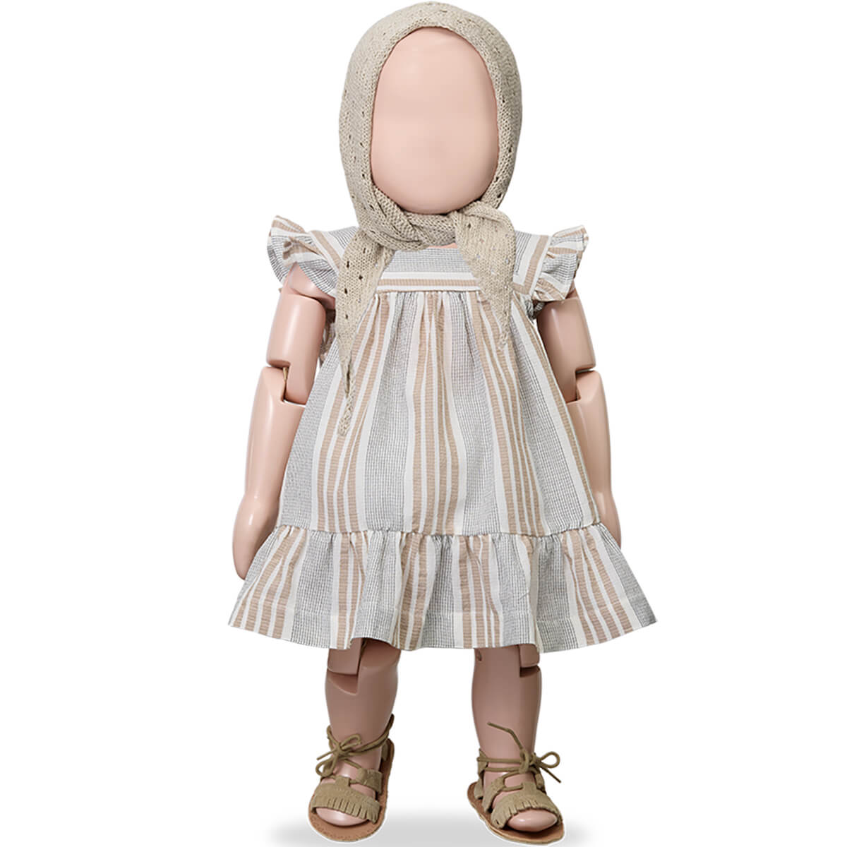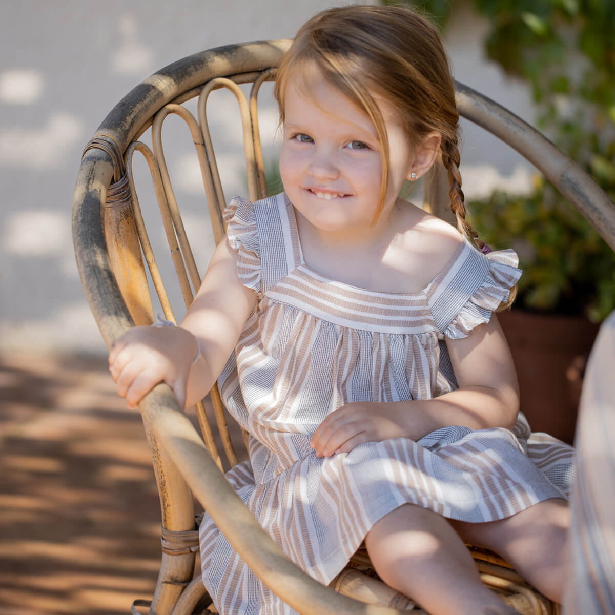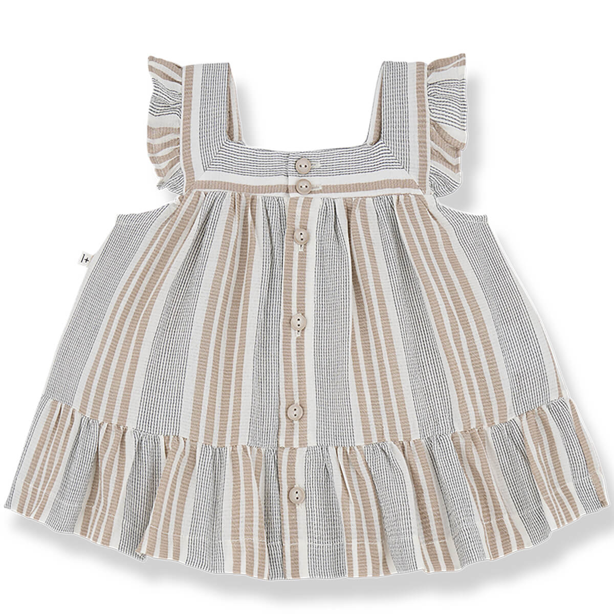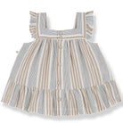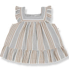 Miriam Dress by 1+ in the Family. Short-sleeve baby dress in soft striped fabric with wooden buttons.