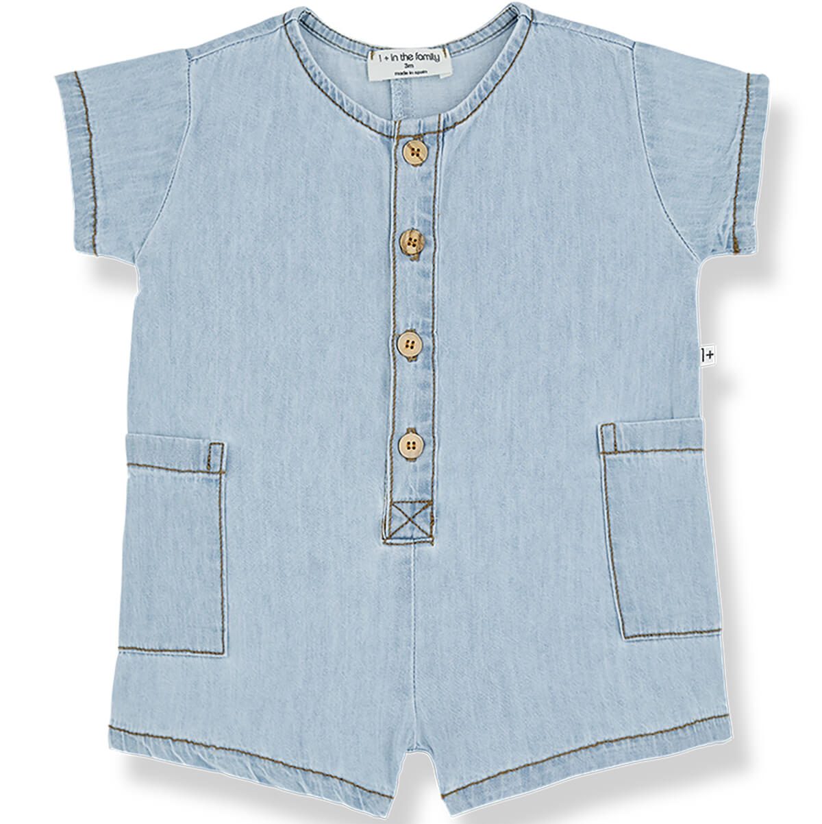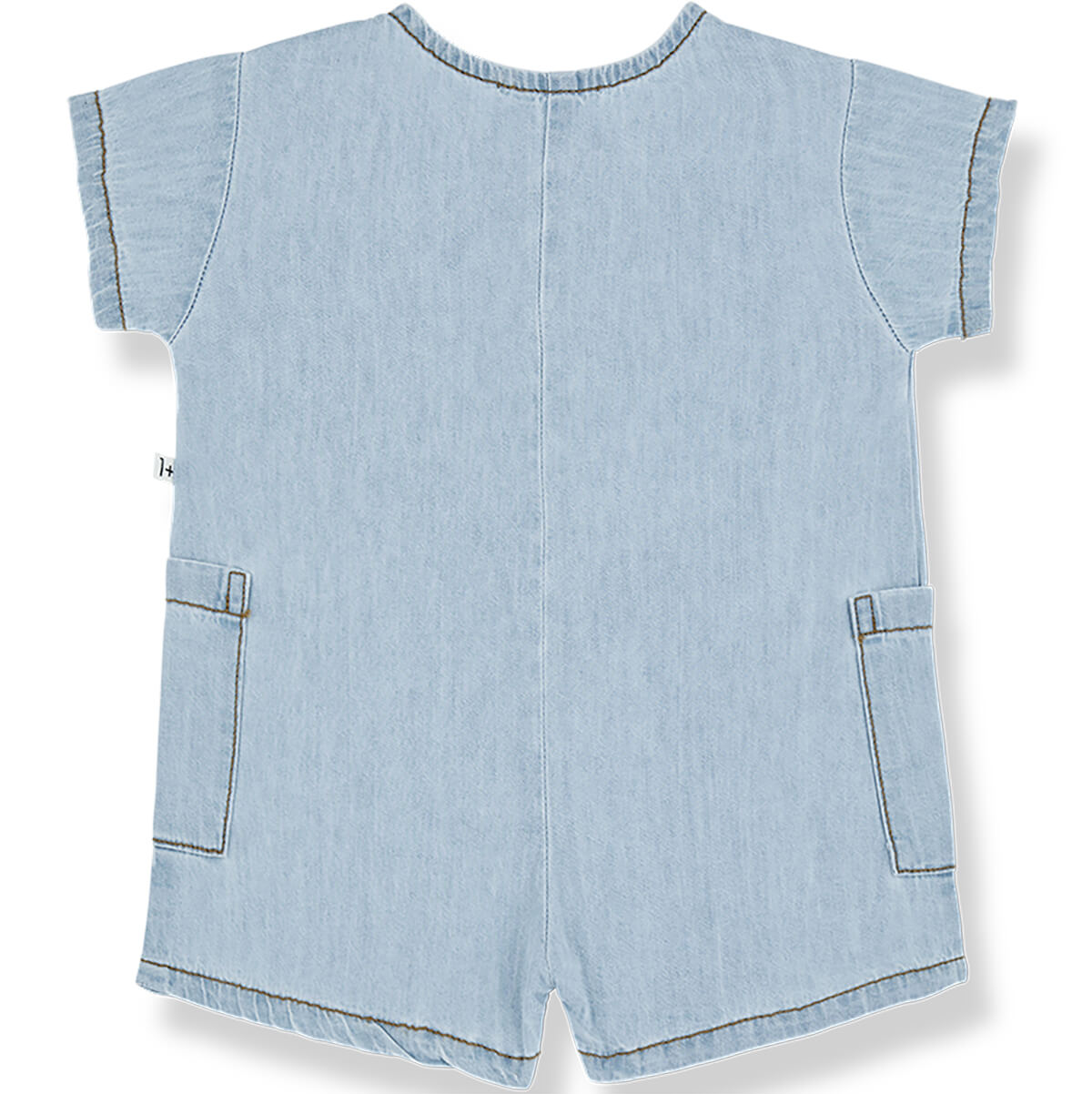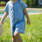 Serena Overall by 1+ in the Family. Short baby one-piece with wooden buttons and pockets.
