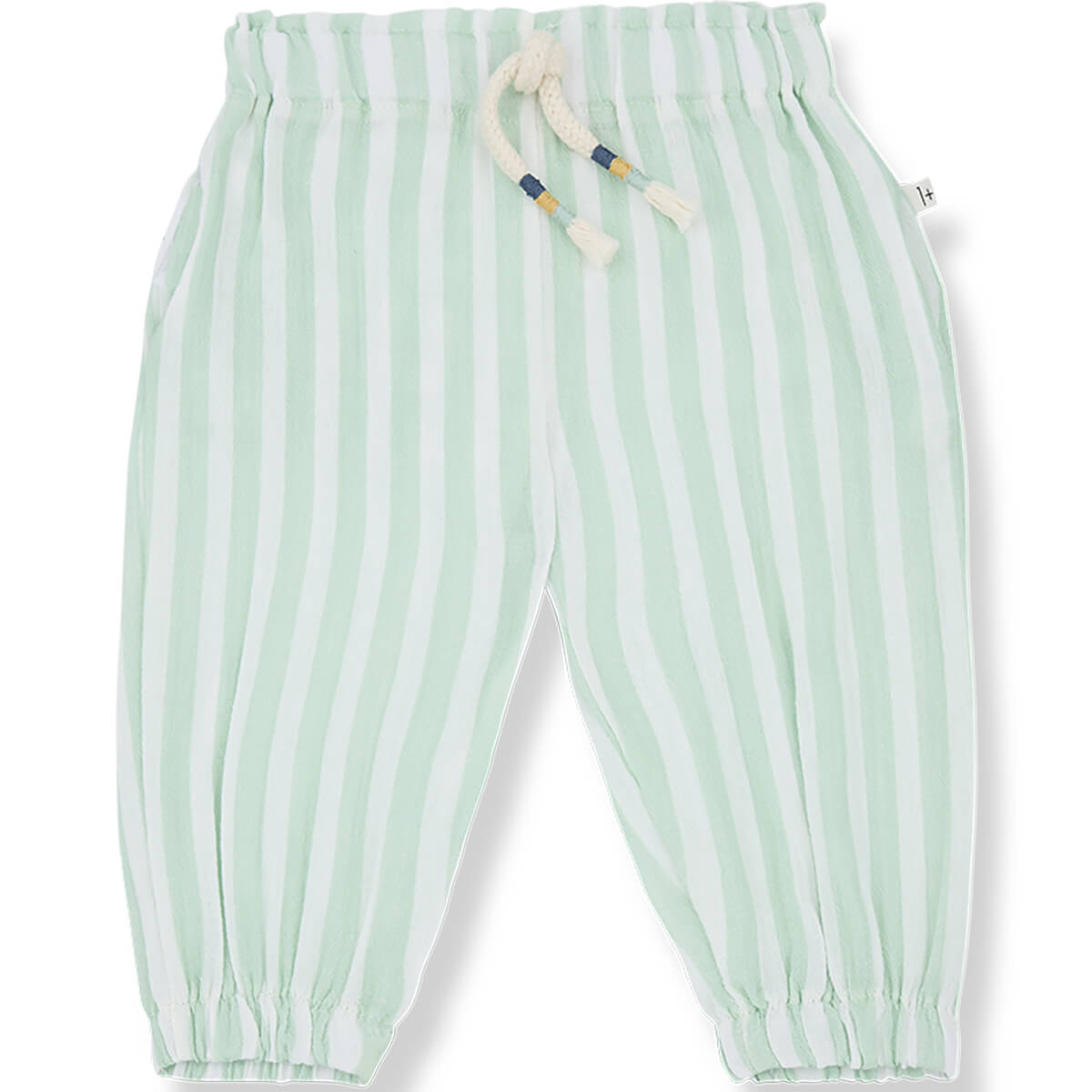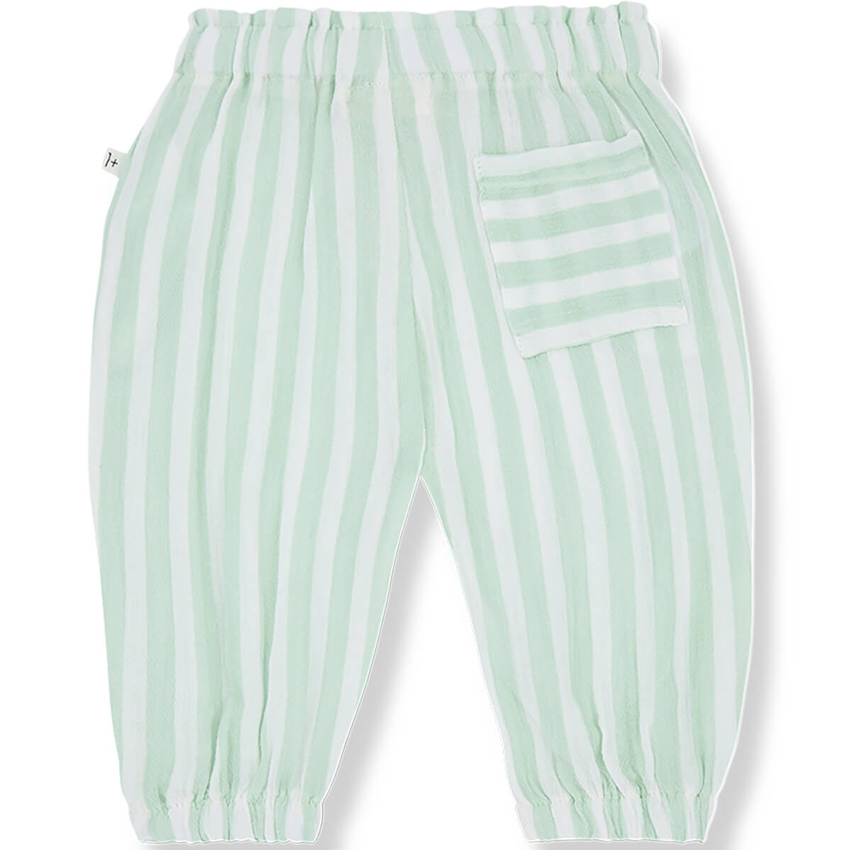 Zoe Pants by 1+ in the Family. Soft striped baby trousers with a drawstring waist, side pocket and back pocket.