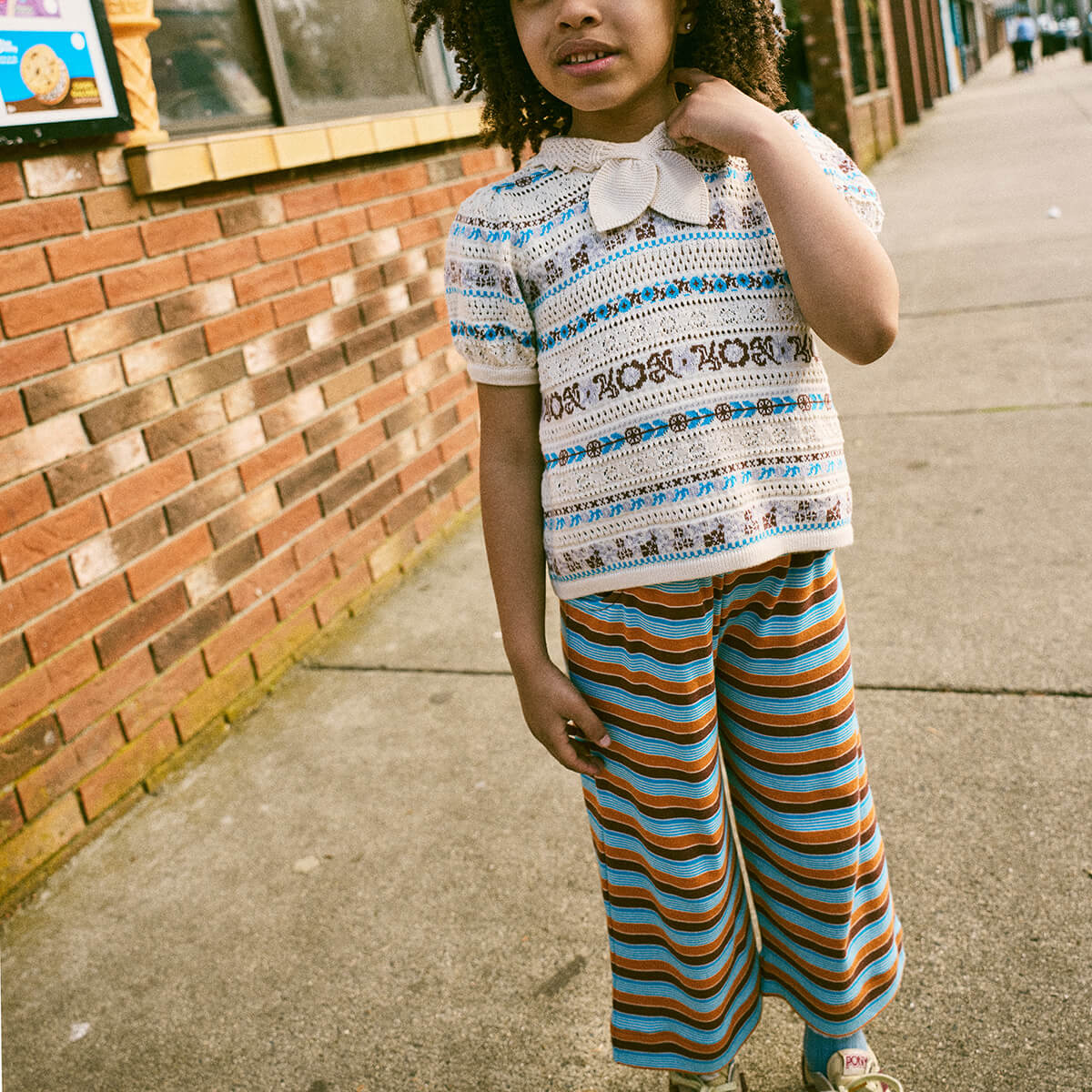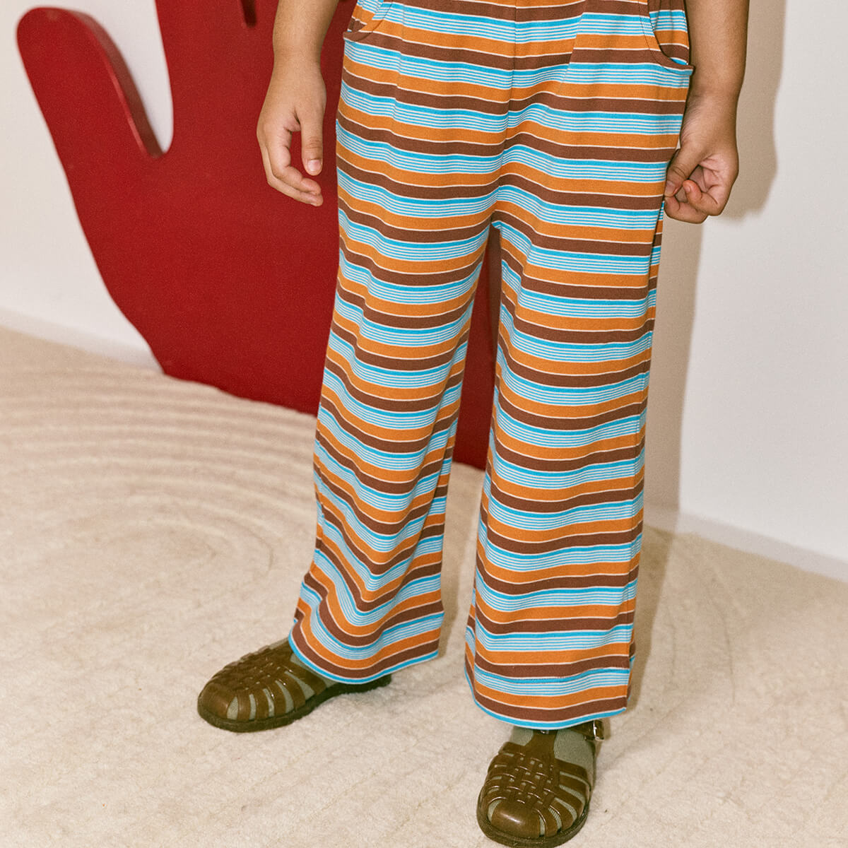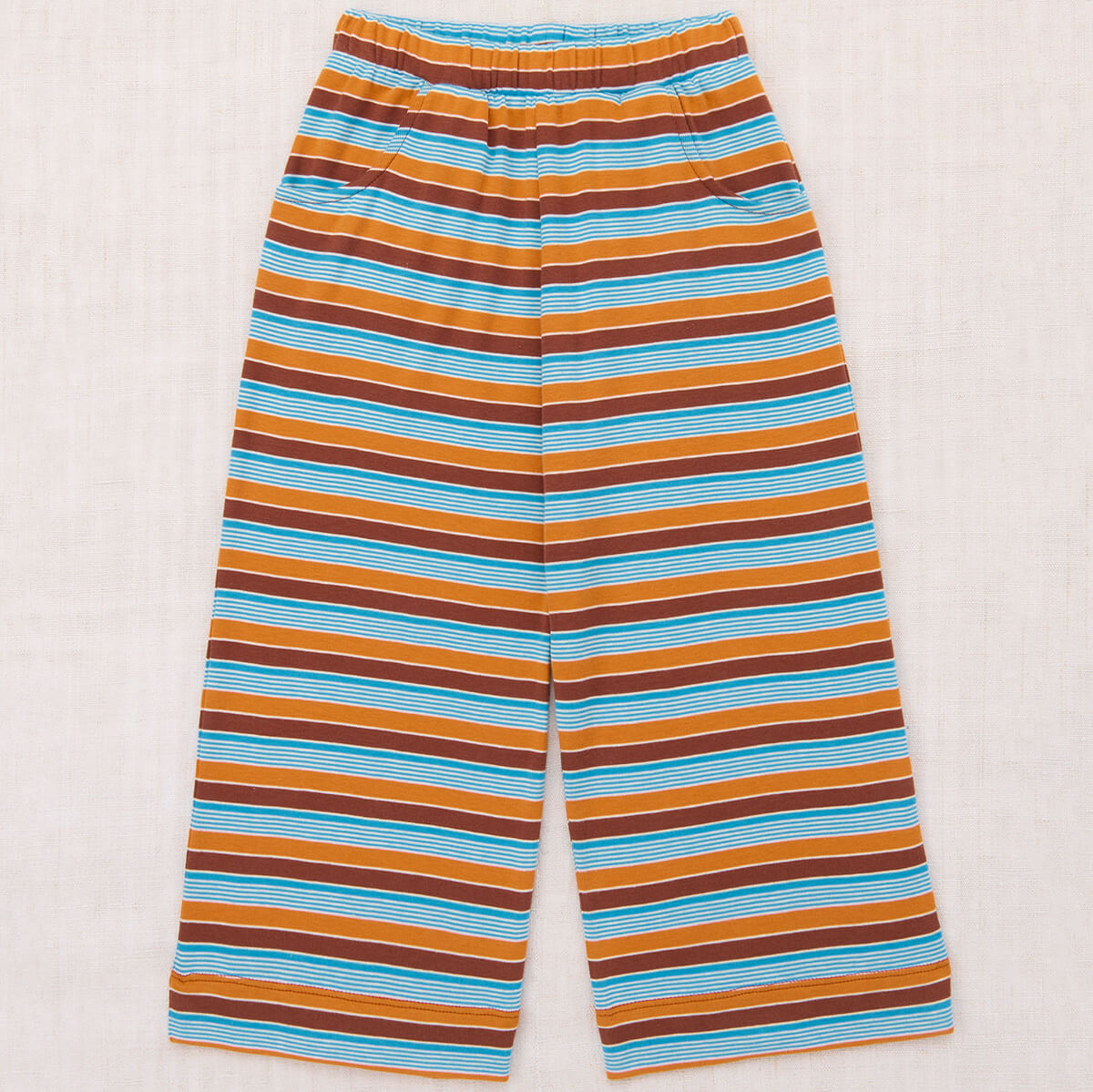 Beach Pant by Misha & Puff. Wide-leg pull-on pants in organic Pima cotton, with an elastic waistband and round curve pockets. Each colour of the stripes featured in this style are dyed separately and then knit together, creating colours that last longer.