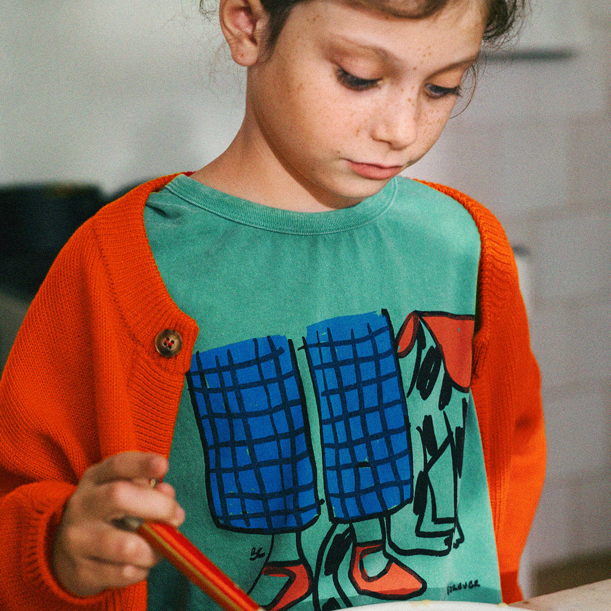 Dog Friendship T-Shirt by Bobo Choses. Green loose-fit tee with short sleeves and a round neck.