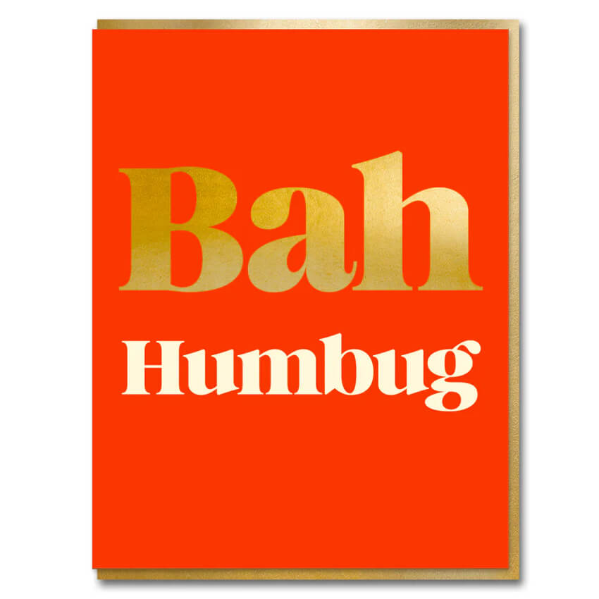 Bah Humbug Christmas greetings card by 1973. This letterpress printed card with gold foiling features an illustration by 1973.