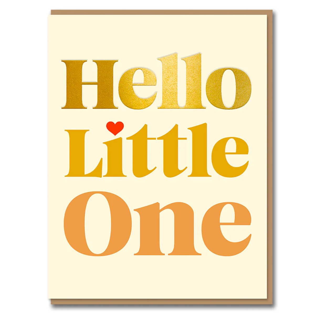 Hello little one greetings card by 1973. This litho printed card with gold foiling details features an illustration by 1973. Blank inside with kraft envelope.