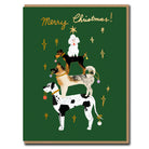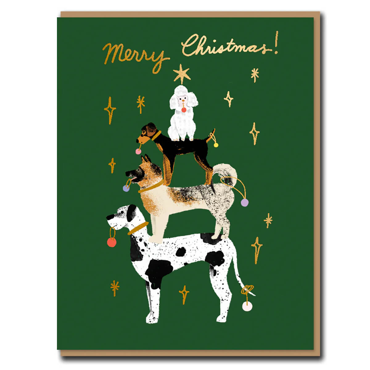 Pup tree Christmas greetings card by 1973. Features an illustration by Carolyn Suzuki. Blank inside with kraft envelope.