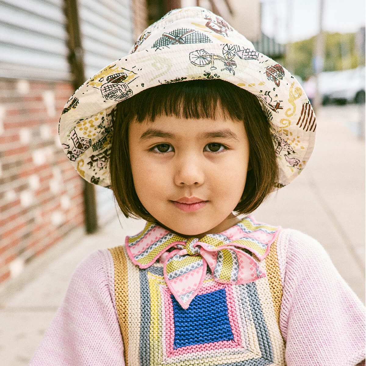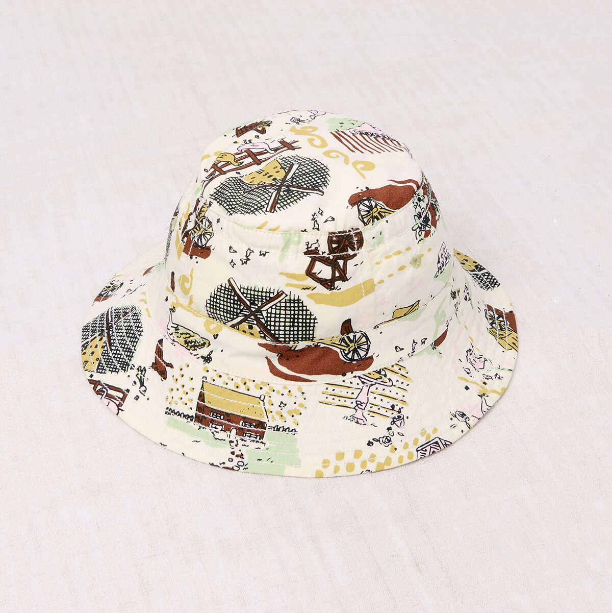 Bucket Hat by Misha & Puff. A classic bucket hat in organic cotton poplin. A go-to favourite. The print originates from a hand-painted design, with storybook scenes carefully translated into fabric.