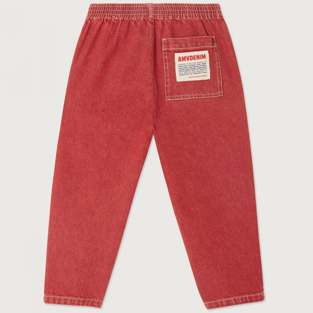 Uzatown kid's denim joggers by American Vintage. Jogging bottoms with an elasticated waist in red denim. "AMV Denim" logo in white printed on the back pocket.