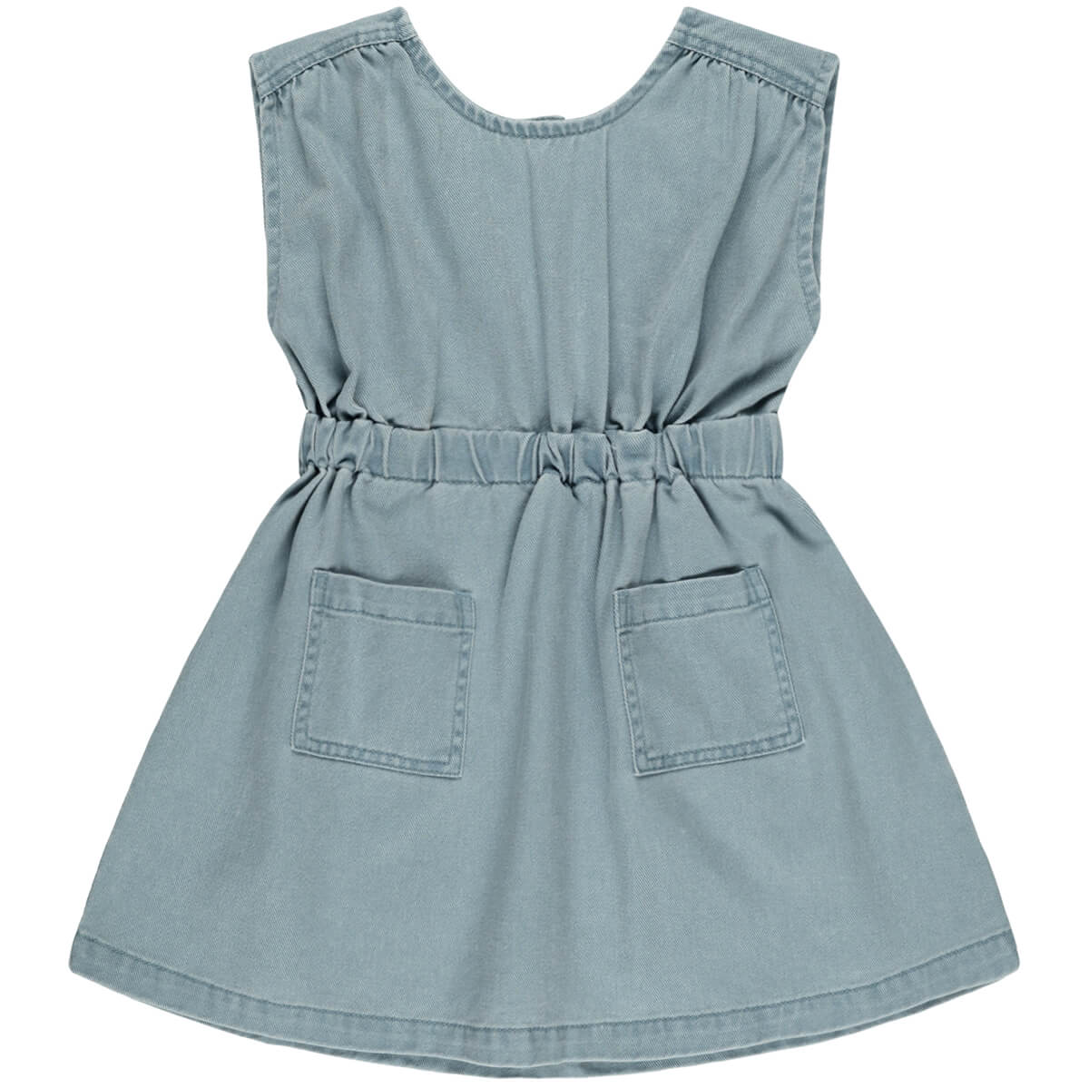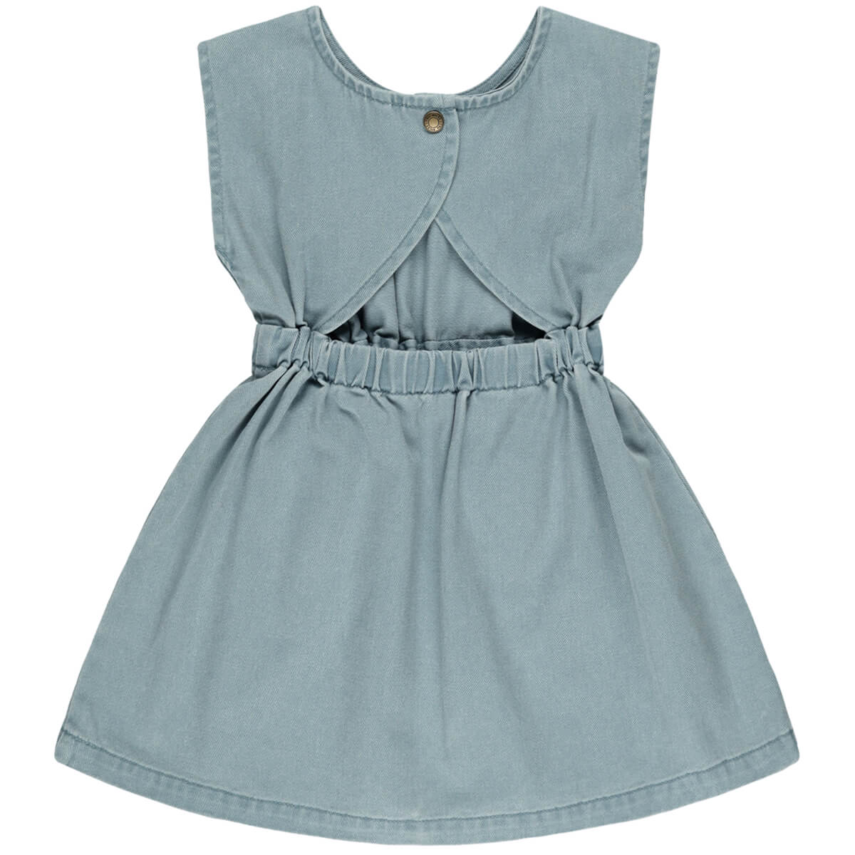 Denim mini dress by Rylee & Cru. Lightweight denim A-line mini dress with front patch pockets, a triangular back cut-out that comes together with a snap at the back neck and elastic casing at waist.