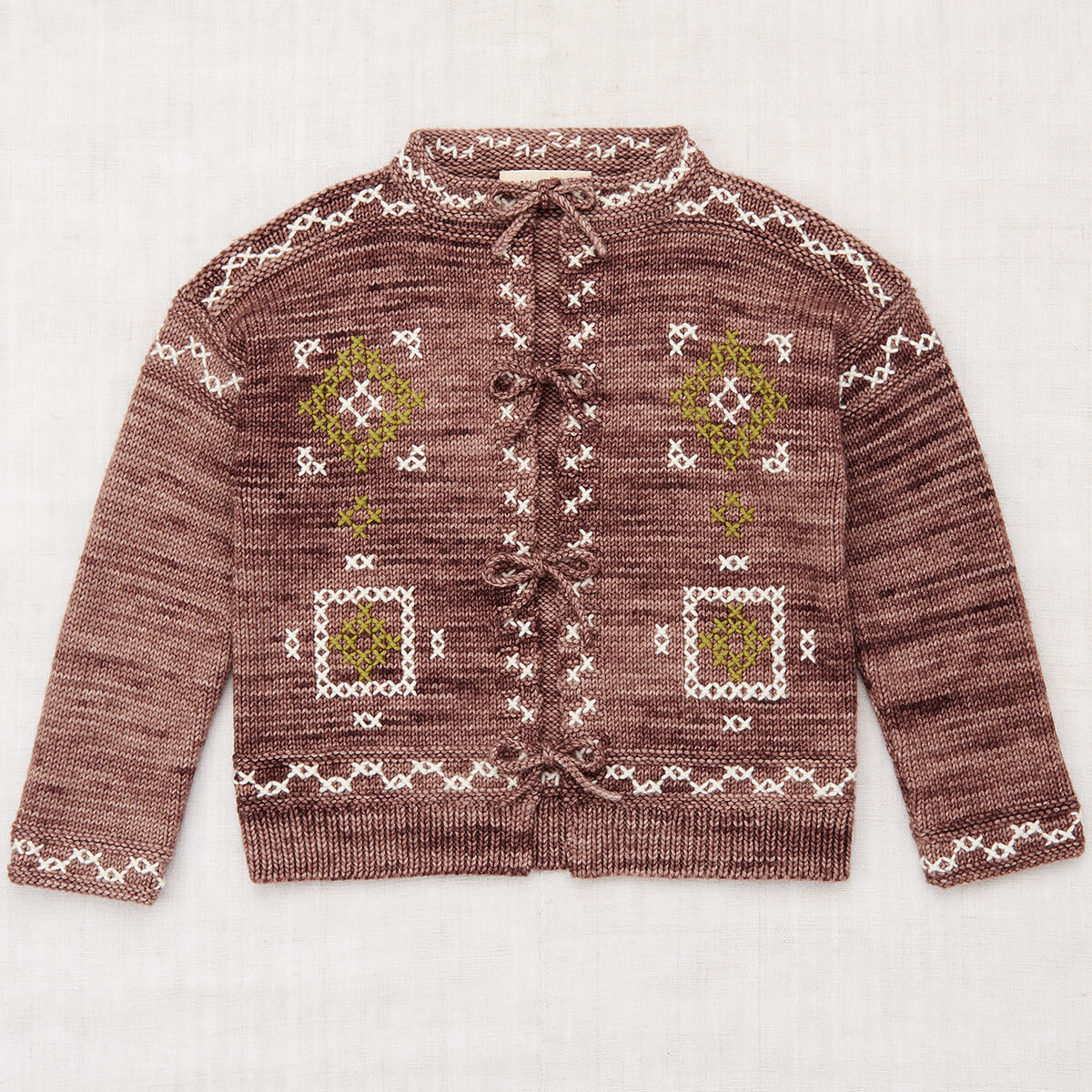 Cross Stitch Bjorn Cardigan by Misha & Puff. A Scandi-inspired cardigan in Merino wool, with a short stand collar, ribbed hem, and a tie-front closure. Finished with hand-embroidered cross-stitch designs.