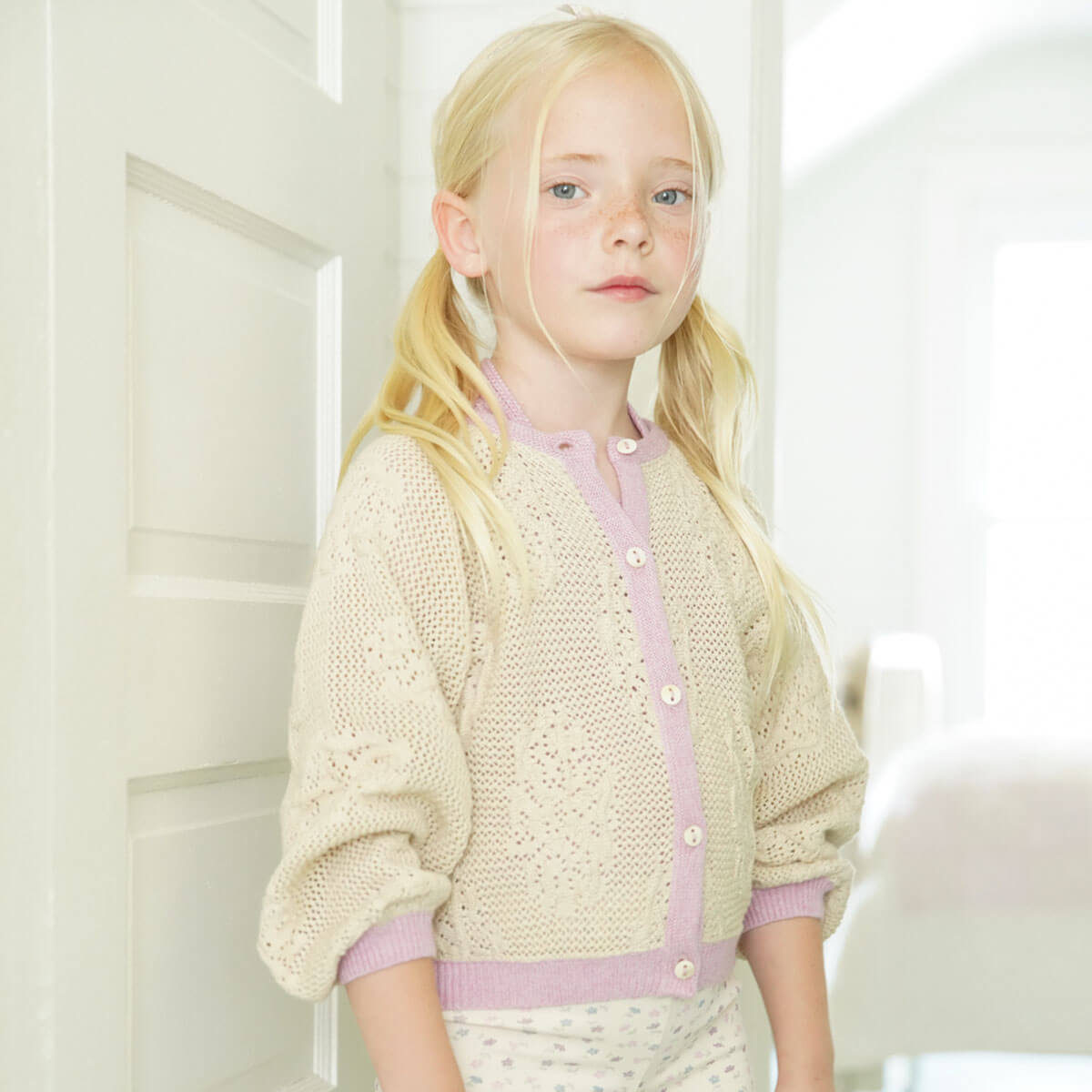 Lettie Cardigan by Soor Ploom. Loose fit cardigan in textured floral motif with contrast rib at the neck, placket, sleeve cuff and hem.