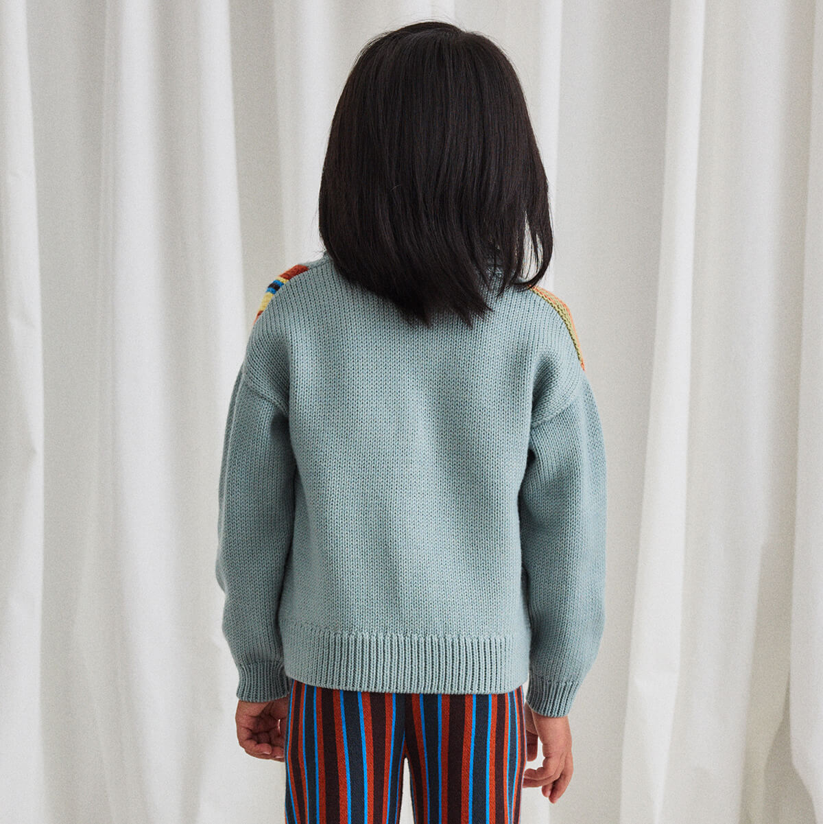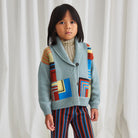 Patchwork Shawl Collar Cardigan by Misha & Puff. A patchwork cardigan in Merino wool, featuring hand-knit multi-color mitered squares designs, a shawl collar, ribbed cuffs and hem, and a horn button closure.