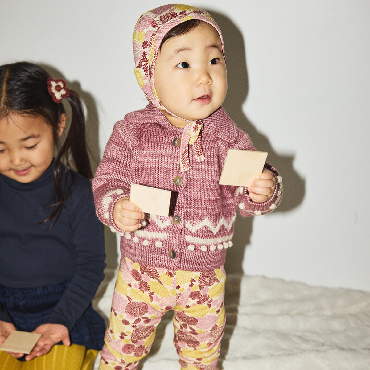 Baby Zig Zag Cardigan by Misha & Puff. A cozy vintage-style cardigan in Merino wool, featuring hand-worked popcorn stitch detail, a zig zag motif, point collar, ribbed trim, and horn button closures, including at the collar. Perfectly balanced between roomy and tailored.