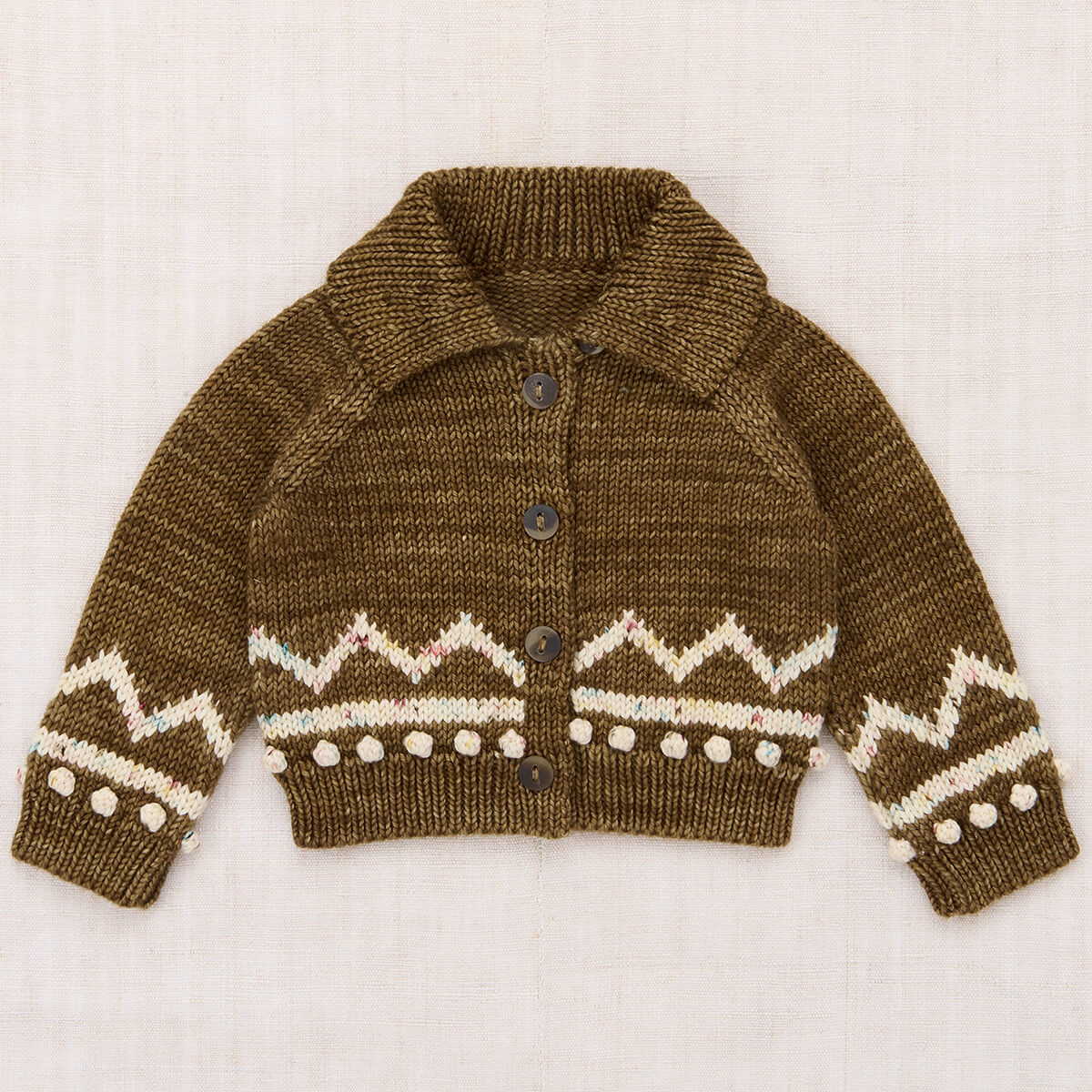 Baby Zig Zag Cardigan by Misha & Puff. A cozy vintage-style cardigan in Merino wool, featuring hand-worked popcorn stitch detail, a zig zag motif, point collar, ribbed trim, and horn button closures, including at the collar. Perfectly balanced between roomy and tailored.