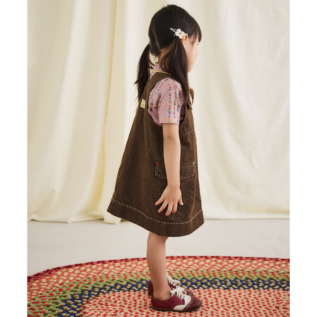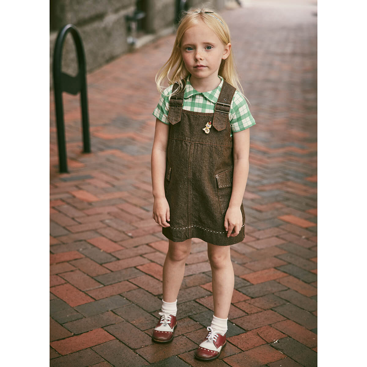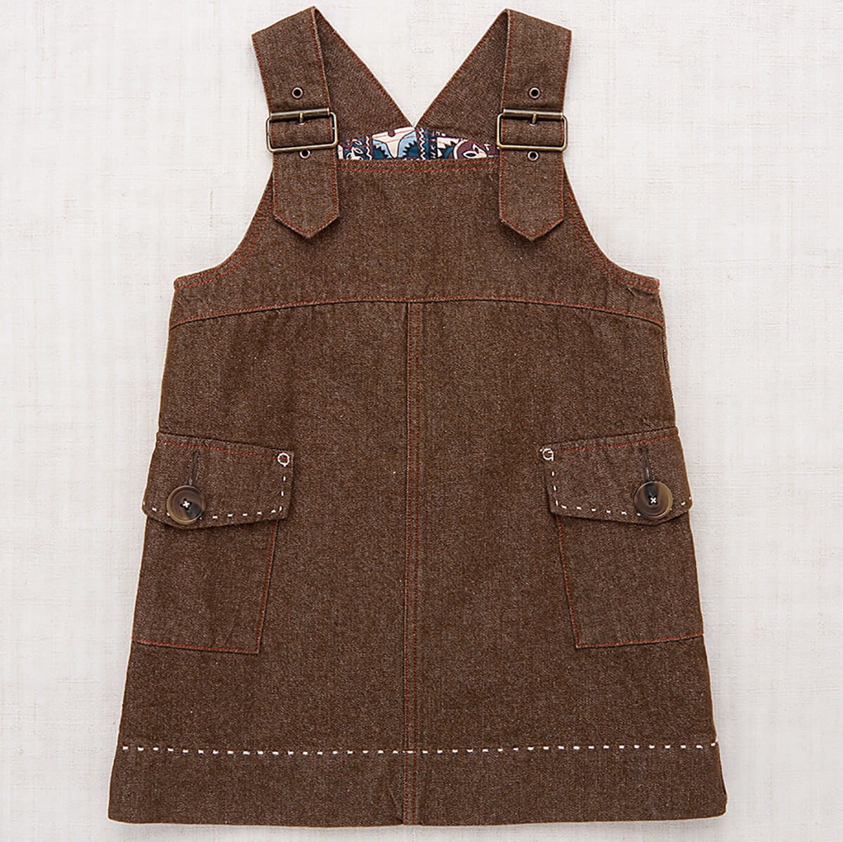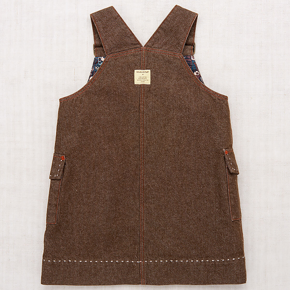 Buckle Jumper Dress by Misha & Puff. A vintage-inspired jumper dress in 100% cotton denim, featuring adjustable buckle straps, two patch pockets with horn button closure, a print-lined bib, and contrast topstitch detail. Finished with hand-tacked stitches instead of rivets for softness.