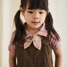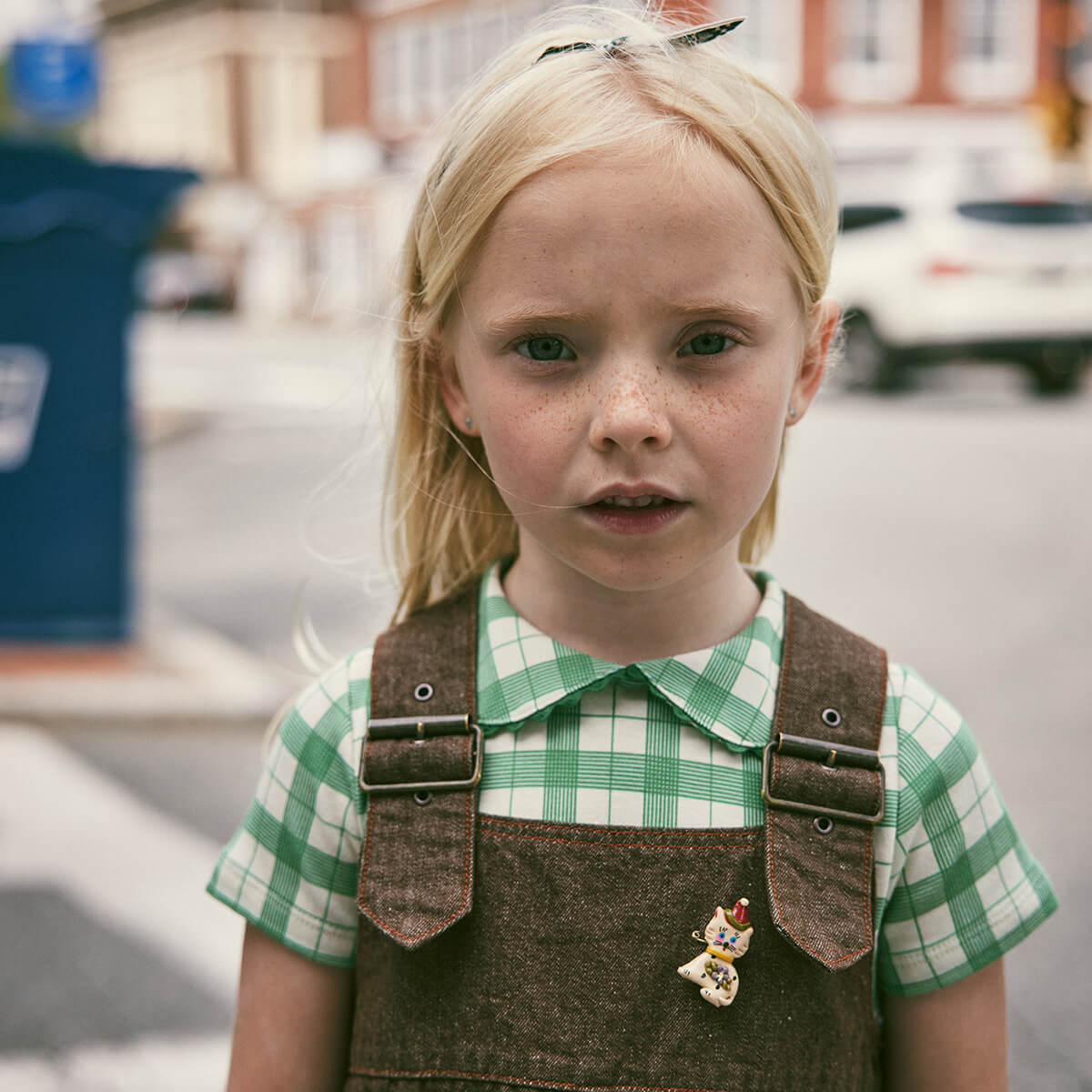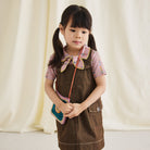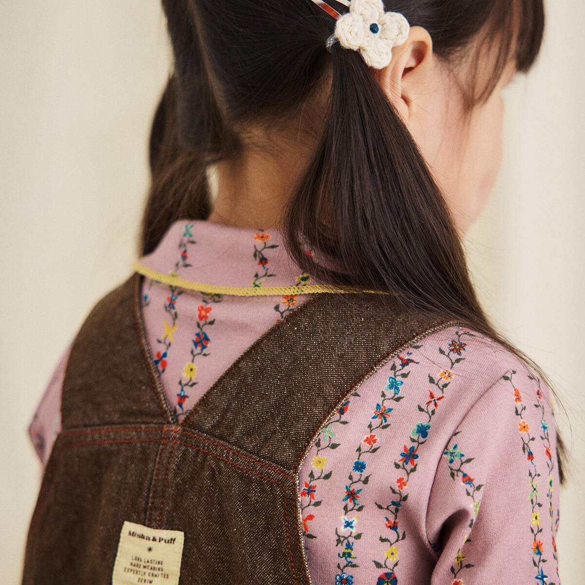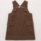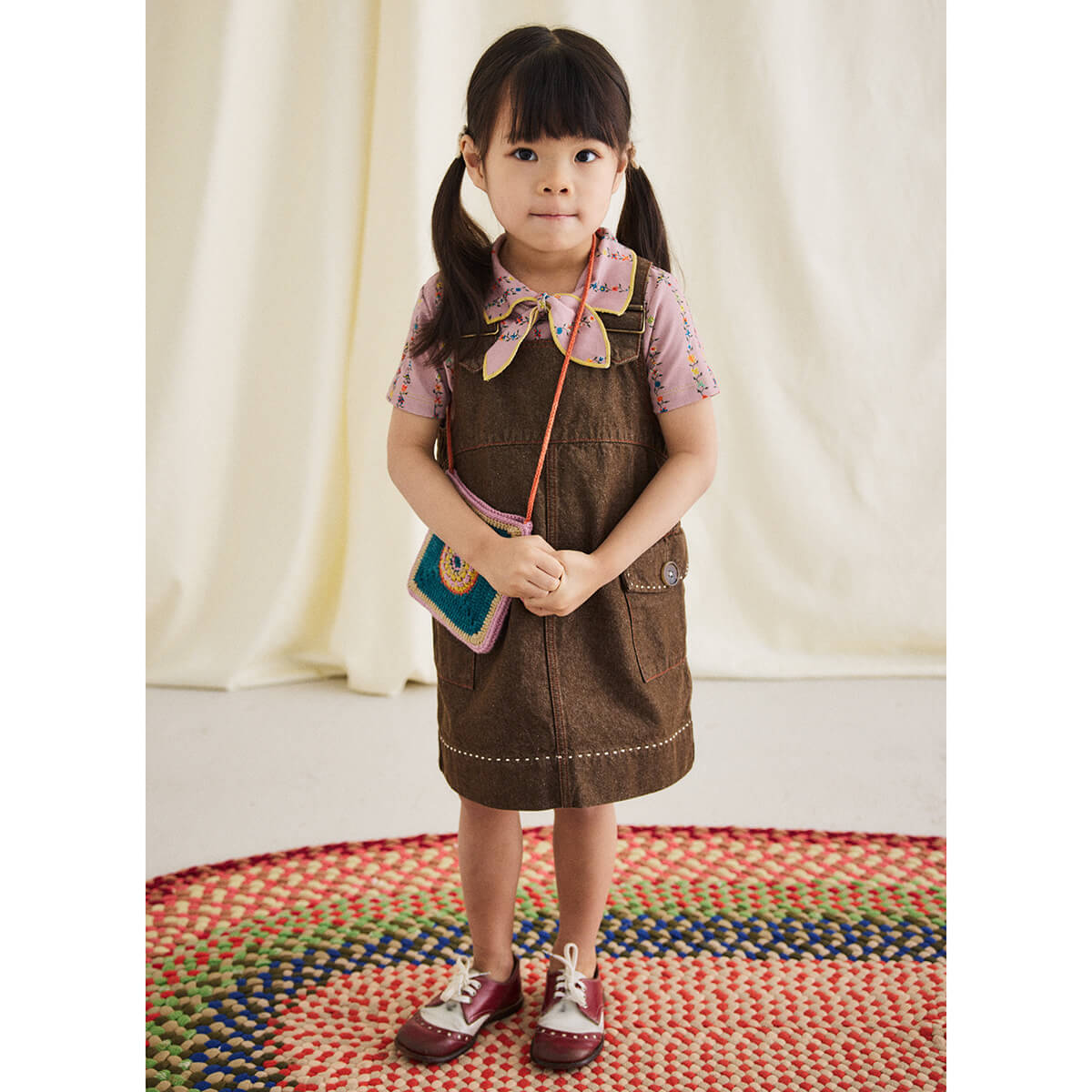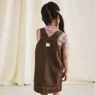 Buckle Jumper Dress by Misha & Puff. A vintage-inspired jumper dress in 100% cotton denim, featuring adjustable buckle straps, two patch pockets with horn button closure, a print-lined bib, and contrast topstitch detail. Finished with hand-tacked stitches instead of rivets for softness.
