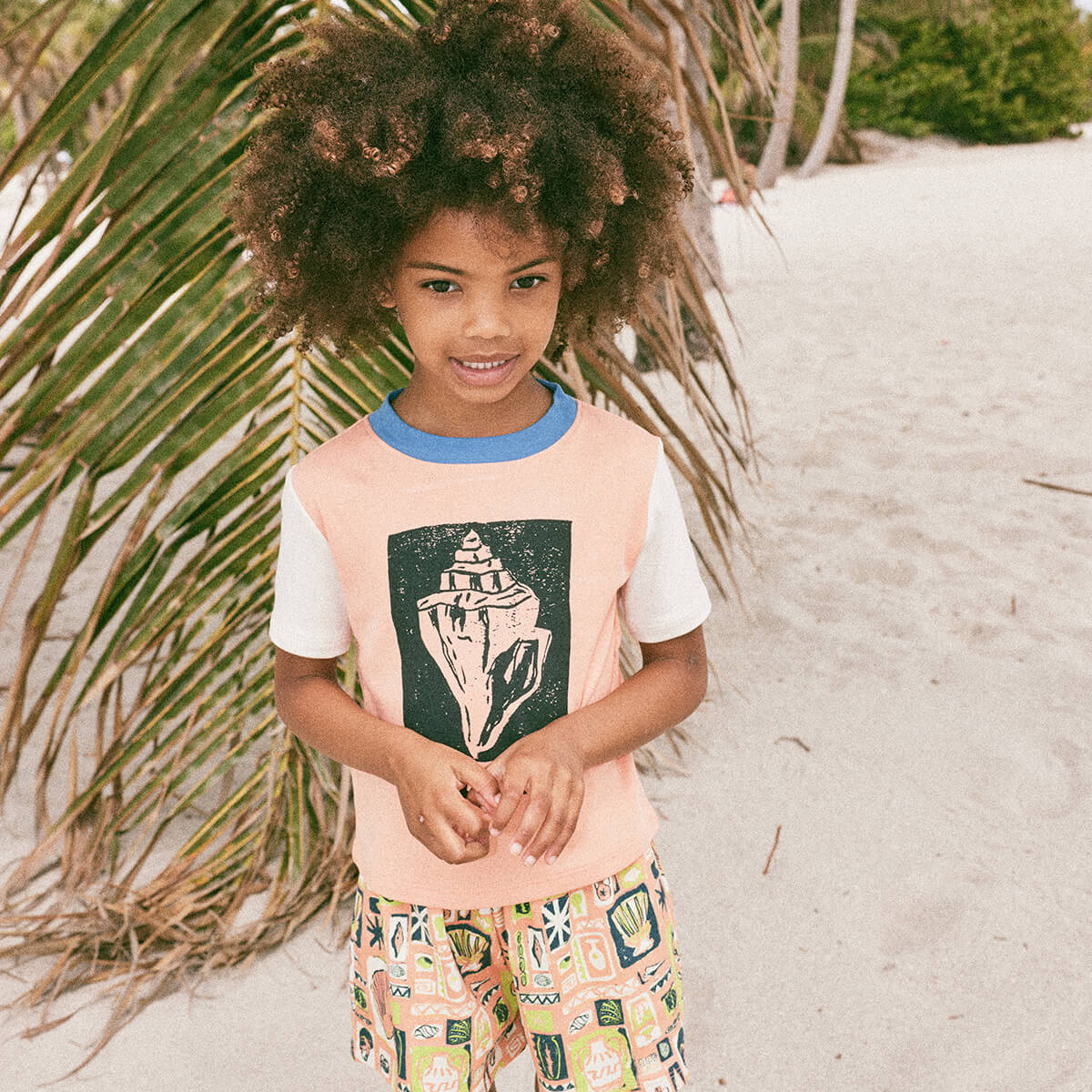 Collect Ringer Tee in Flamingo by Misha & Puff. A classic slim-fit ringer tee in soft Pima cotton, with contrasting neckline, sleeves, and body. Featuring a hand-carved and crafted print.