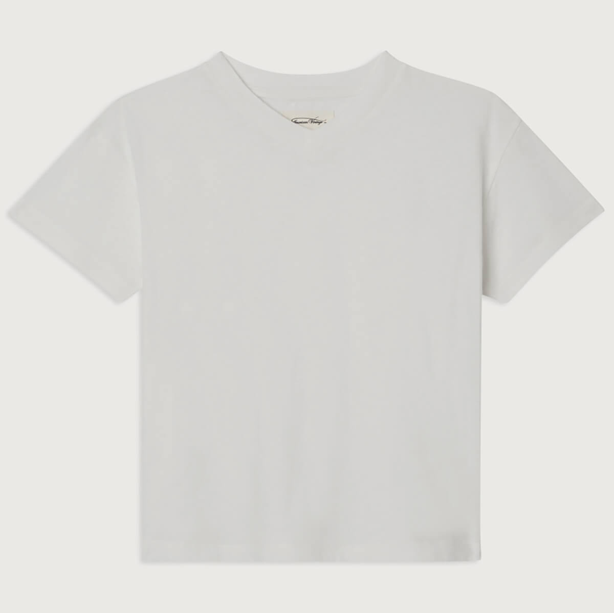 Gamipy kid's V neck T shirt by American Vintage. Simple straight cut short sleeve tee with a V neck and dropped shoulders. No logos, stylish simplicity.