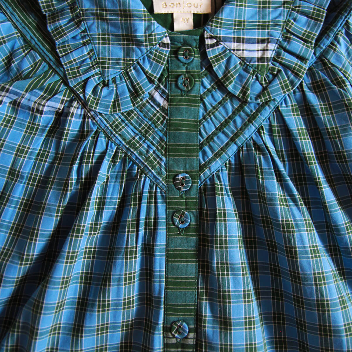 Iris Blouse by Bonjour. A floral print blouse with covered buttons and ruffle detailing at the collar and cuffs.