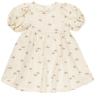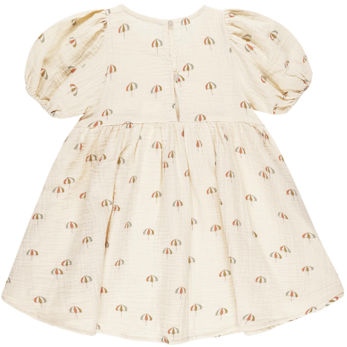 Marley dress by Rylee & Cru. This adorable dress features pretty puff sleeves and a baby doll inspired silhouette with a curved waistline, scooped neck, and button back closure. This vintage beach umbrella print is giving off endless summer vibes.