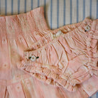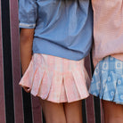 Pleated Skirt and Panty Set in Pink Jacquard Flower Check by Bonjour. Pleated pink skirt with matching panty in cotton check fabric with gold dot detail.