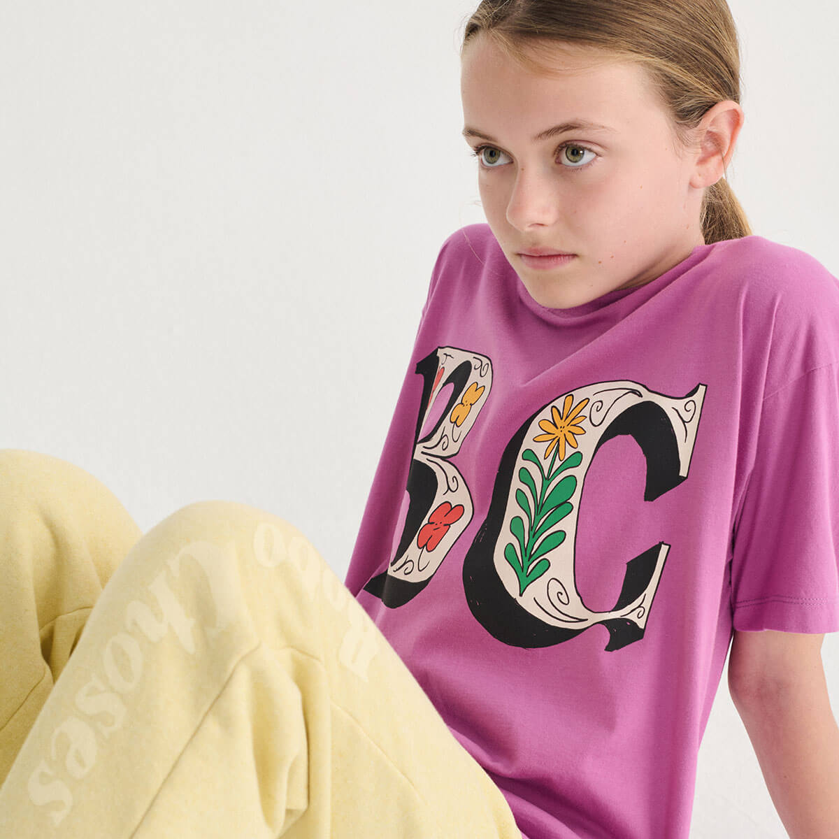 Spring Letters T-Shirt by Bobo Choses. Purple relaxed-fit tee with short sleeves and a round neck featuring a floral BC lettering design.