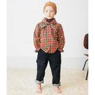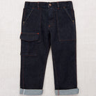Utility Jeans by Misha & Puff. From Misha & Puff's brand new Denim Collection — a relaxed tapered-leg jean in 100% cotton denim, with four standard pockets, one utility cargo pocket, contrast print lined pockets, contrast topstitch detail, and and interior adjustable cinched elastic waistband in the back for the perfect fit. Finished with hand-tacked stitches instead of rivets for softness.