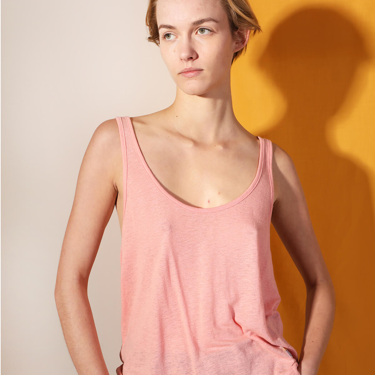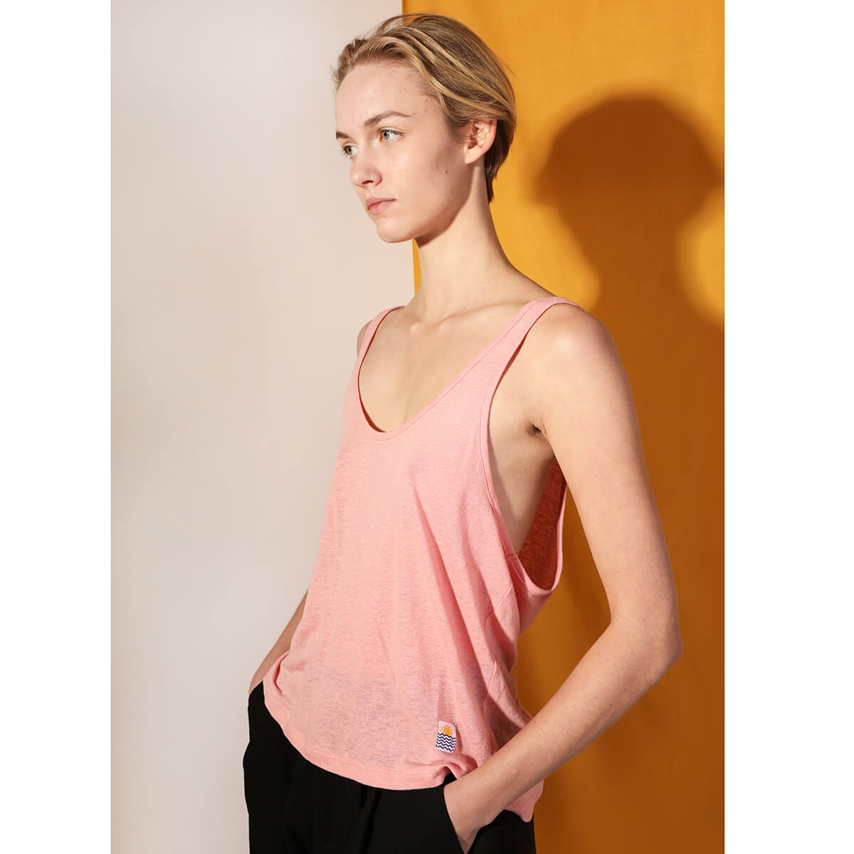 Square Cut Tank by L.F. Markey. A lightweight linen blend jersey tank top with a scoop neckline, loose boxy fit and slight crop. In bright blossom pink, the perfect layering piece. With sun and sea woven patch logo. Relaxed fit vest top in a lovely drapey fabric.