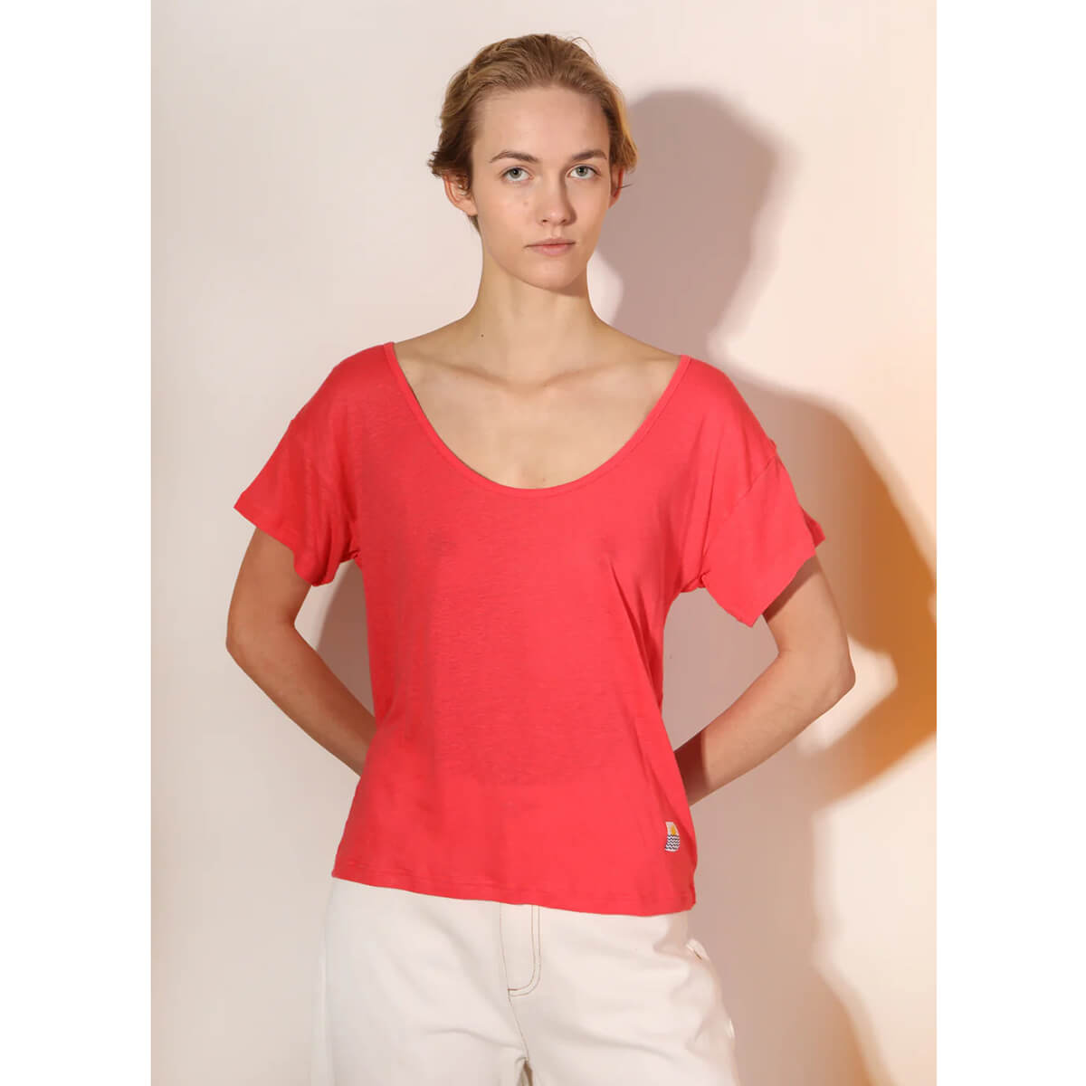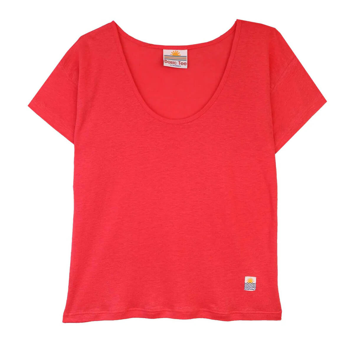 Square Cut Tee by L.F. Markey. A lightweight linen blend jersey tee with a scoop neckline, loose boxy fit and slight crop. In bright raspberry pink, the perfect layering piece. With L.F. Markey's sun and sea woven patch logo.