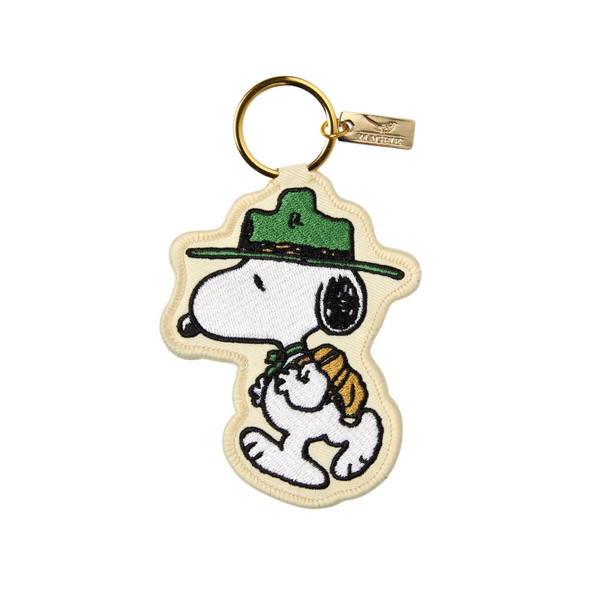 Camp Snoopy Keyring by by Magpie. Embroidered patch style key charm. Double sided embroidered fabric retro patch designs. Comes with golden keyring and golden embossed magpie logo tag. With coloured backing card gift packaging.