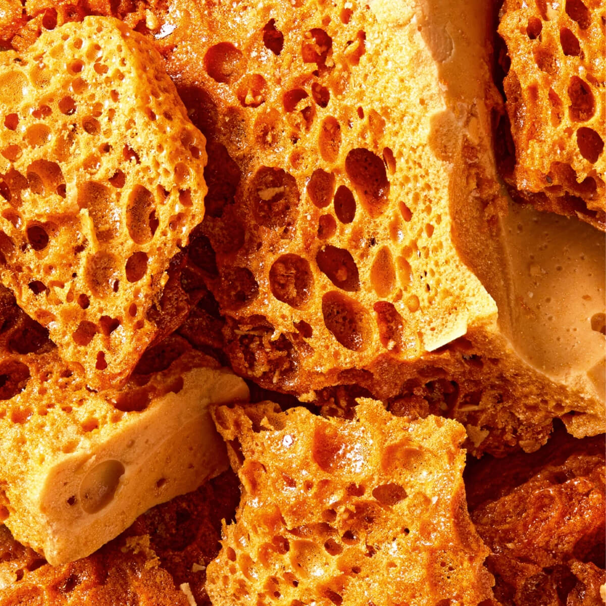 Ingredients: (79%) Macondo Colombian Dark Chocolate (Cocoa Solids 60% Minimum) (cocoa mass, sugar, cocoa butter, emulsifier: soya lecithin; flavouring: natural vanilla), (8%) Fat Coated Honeycomb Granules (sugar, glucose syrup, non- hydrogenated vegetable fat: palm kernal oil, palm oil (RSPO MB SG); raising agent: bicarbonate of soda, rice flour), (5%) Salted Pretzels (flour [wheat flour, calcium, iron, niacin, thiamin], rapeseed oil, sea salt, dextrose, dried yeast, acidity regulator: sodium hydroxide), (5%) Whole Almonds, (less than 1%) Sea Salt Flakes. Produced in a factory that also handles milk, soya, nuts, peanuts and wheat.