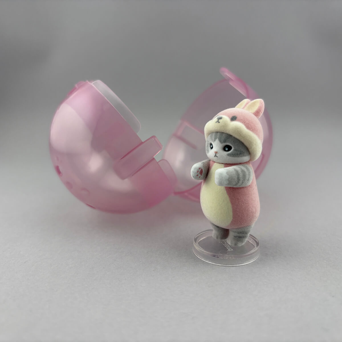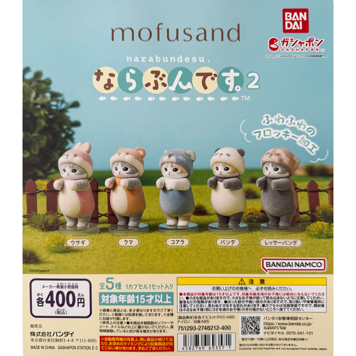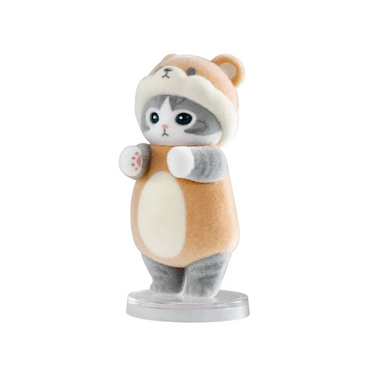 Mofusand Narabundesu Vol.2 Gachapon Capsule Collectible by Bandai. Highly collectible and authentic Japanese gachapon capsule containing one of five different flocked Mofusand cat figurines in animal costumes, complete with a tiny display stand.