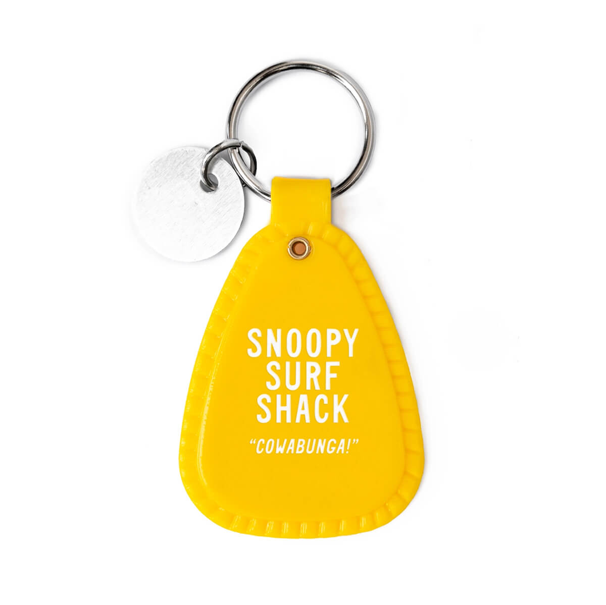 Snoopy Surf Saddle Keychain by Three Potato Four X Peanuts. Inspired by the kind of keychains you used to get for free with an oil change, a surf lesson, or a stop at the local bait & tackle—except this time, they come with Snoopy. A nod to the neighborhood mom-and-pop spots you know Snoopy would roll into: record stores, surf shacks, tennis clubs, and those perfectly random places you only find on a road trip. Lightweight, flexible, and built to ride along on your keys forever. Nostalgic. Collectible. Snoopy approved.