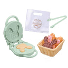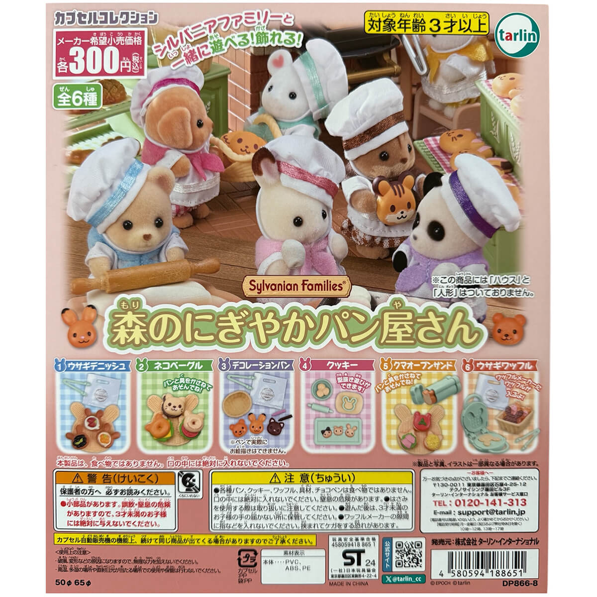 Sylvanian Families Forest Bakery Gachapon Capsule Collectible by Tarlin. Highly collectible and authentic Japanese gachapon capsule containing one of six different Sylvanian Family miniature bakery sets. Beautifully detailed, with animal-themed bakery products and bakery accessories, including a waffle iron, miniature tongs, bakery carrier bag, cookie cutter, rolling pin and more!