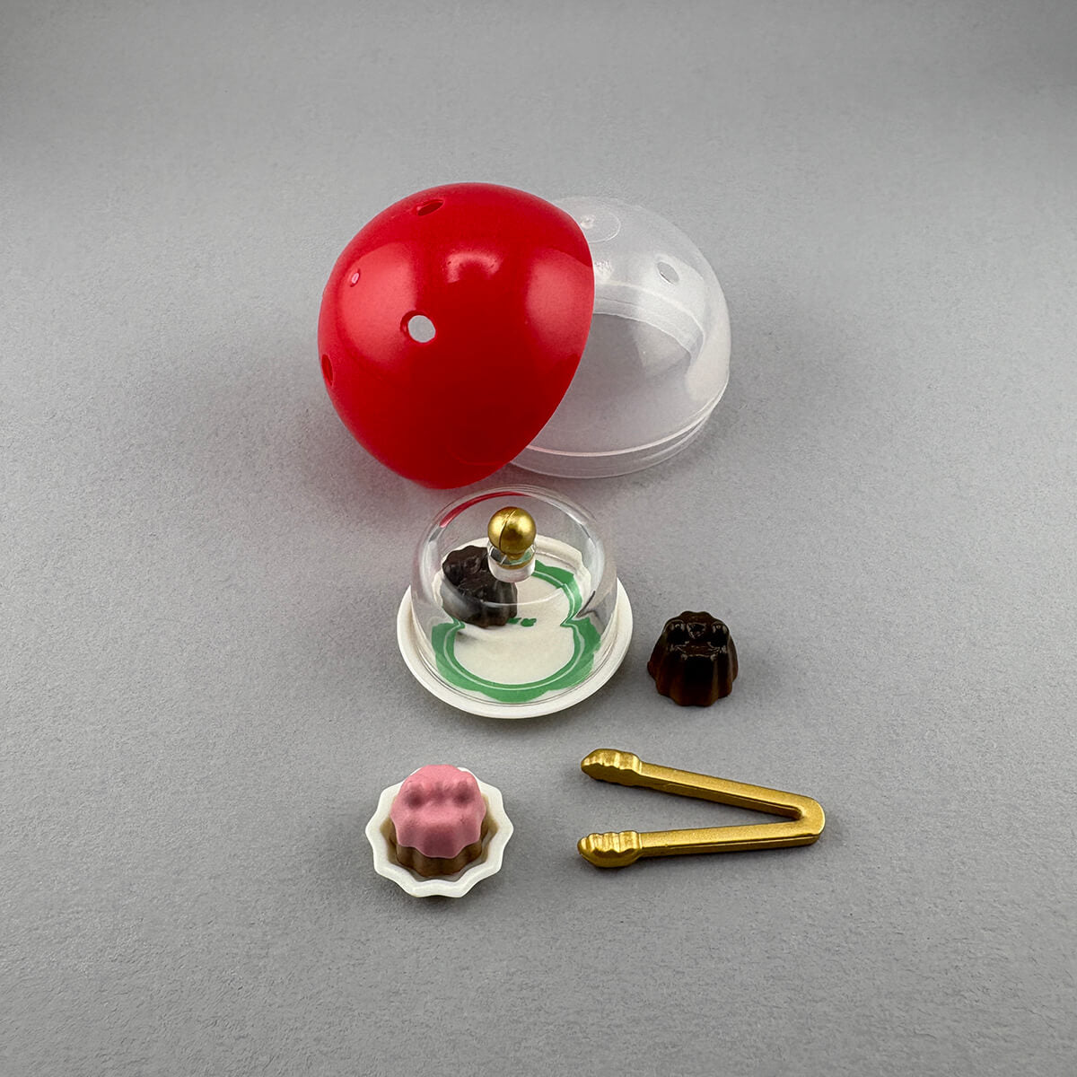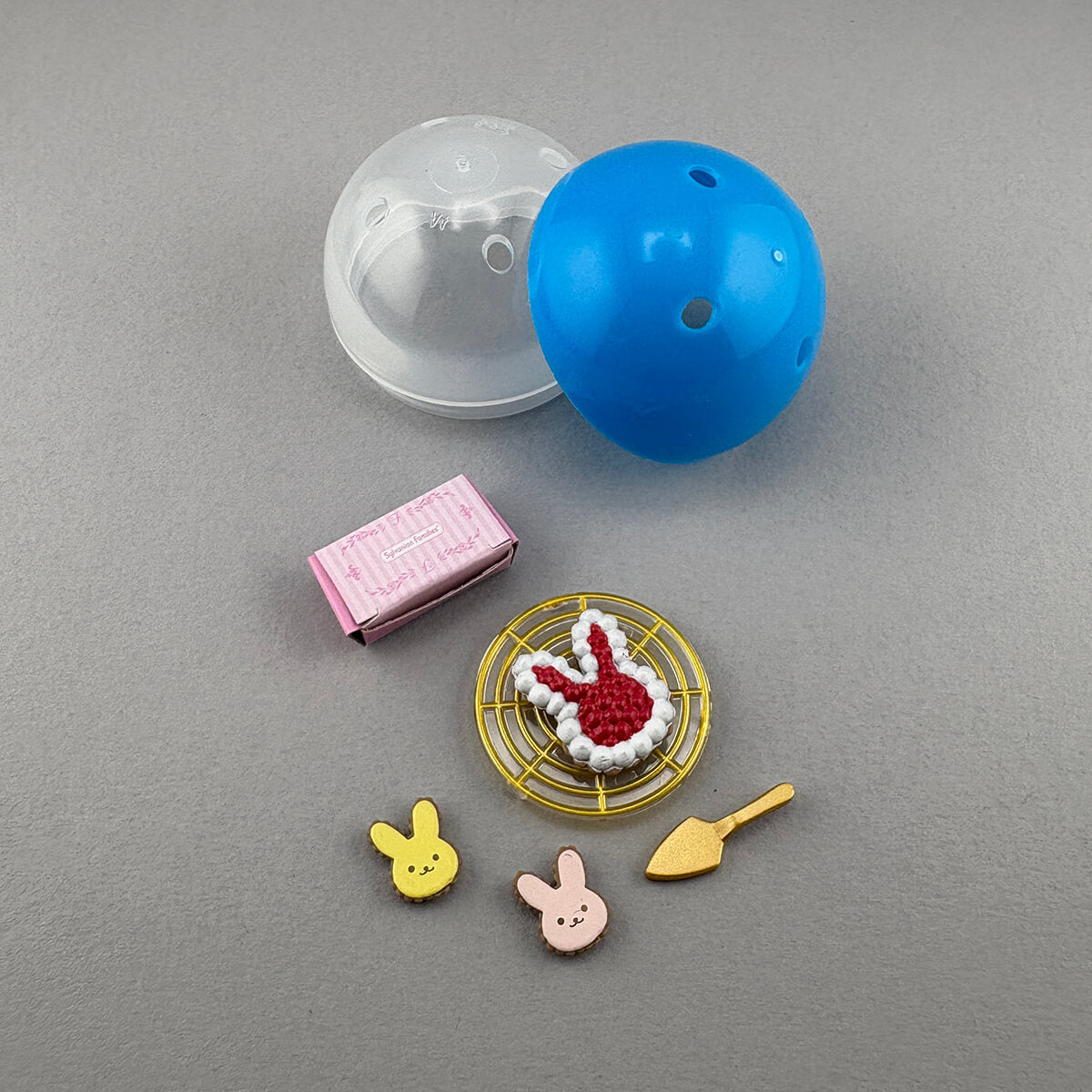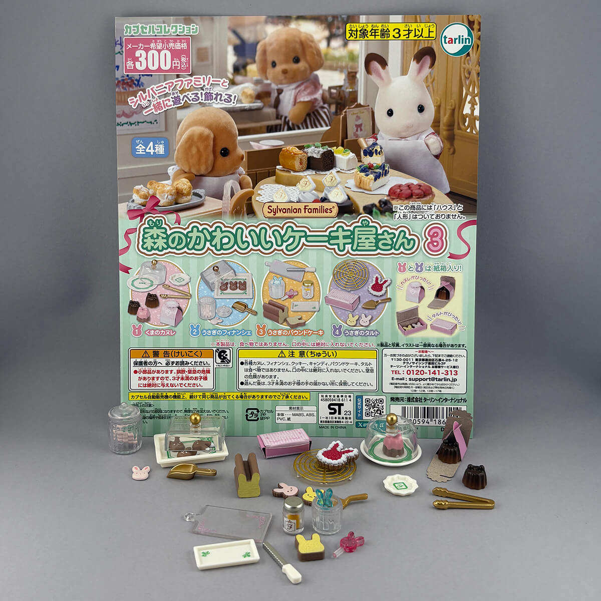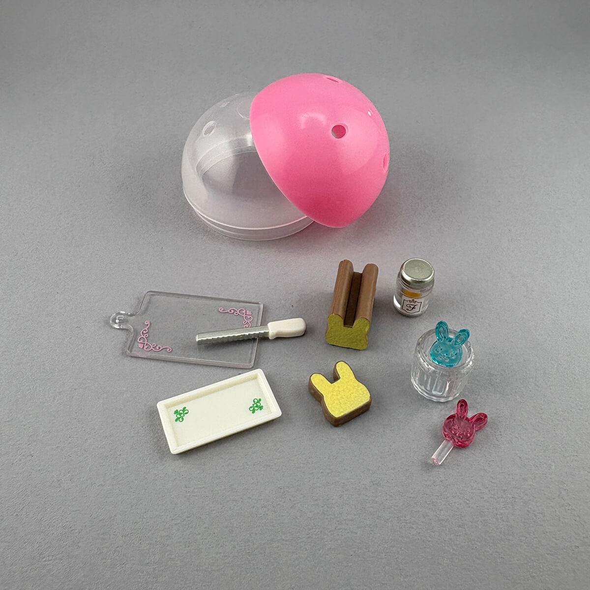Sylvanian Families Forest Bakery Gachapon Capsule Collectible by Tarlin. Highly collectible and authentic Japanese gachapon capsule containing one of four different Sylvanian Family miniature bakery sets. Beautifully detailed, with animal-themed bakery products and bakery accessories, including a miniature cake dome, rabbit and bear shaped cakes, tiny food tongs and much more!