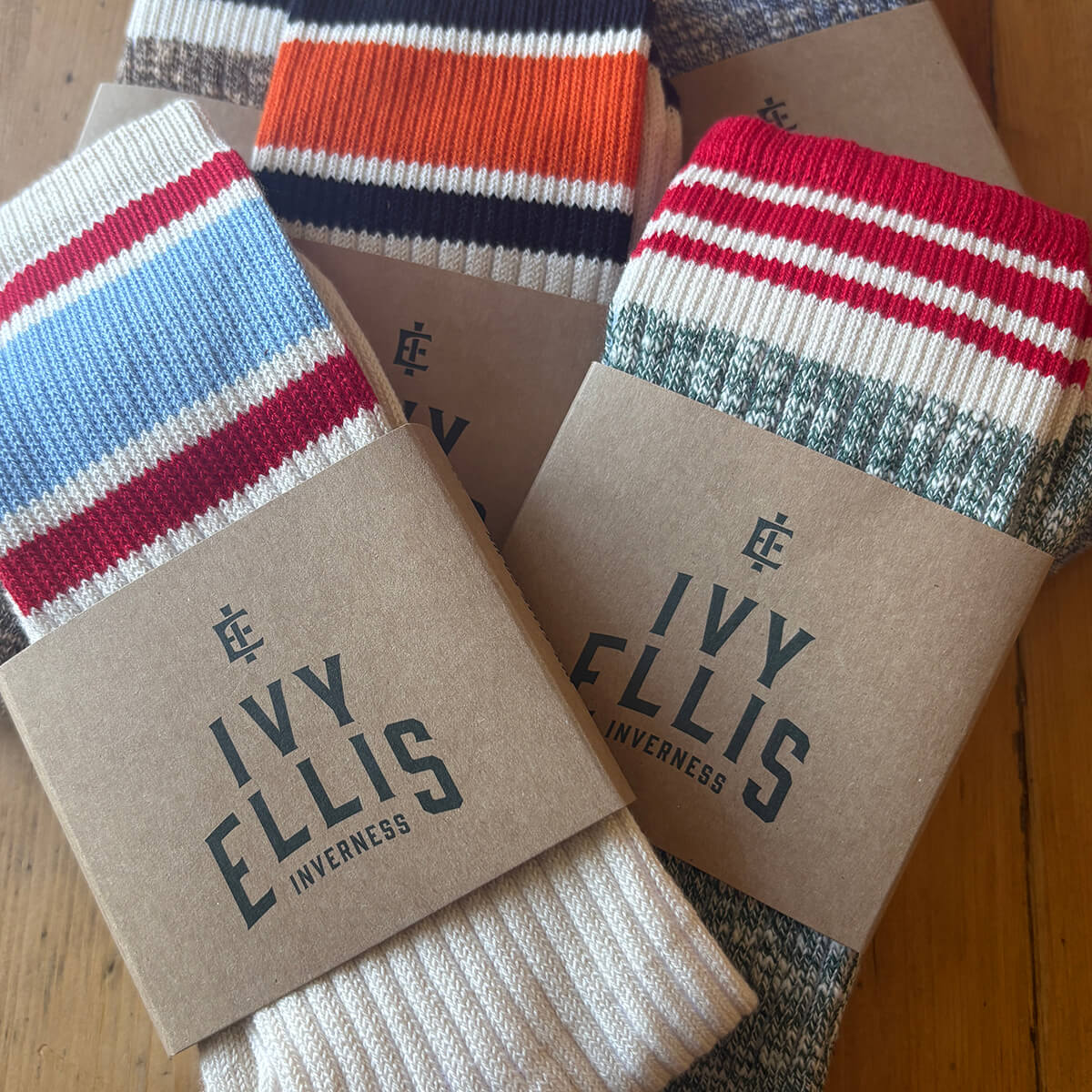 At Ivy Ellis, striped socks are more than just an accessory – they are a celebration of heritage, craftsmanship, and timeless style. Ivy Ellis started in 2020 as a little side project during lockdown, drawing inspiration from growing up in the 80s and American sportwear, varsity fonts and colourways from Ivy League universities. Every pair of Ivy Ellis socks are designed in the UK and crafted in a small, family run factory in the Scottish Highlands. Ivy Ellis make small runs of each design, operating sustainably and making a lasting, quality product. Whether you’re drawn to bold, vintage sports colours or understated preppy Ivy League shades, Ivy Ellis offers a curated collection of striped socks that combine heritage style with modern craftsmanship. Explore the collection today and find the perfect pair to suit your style.