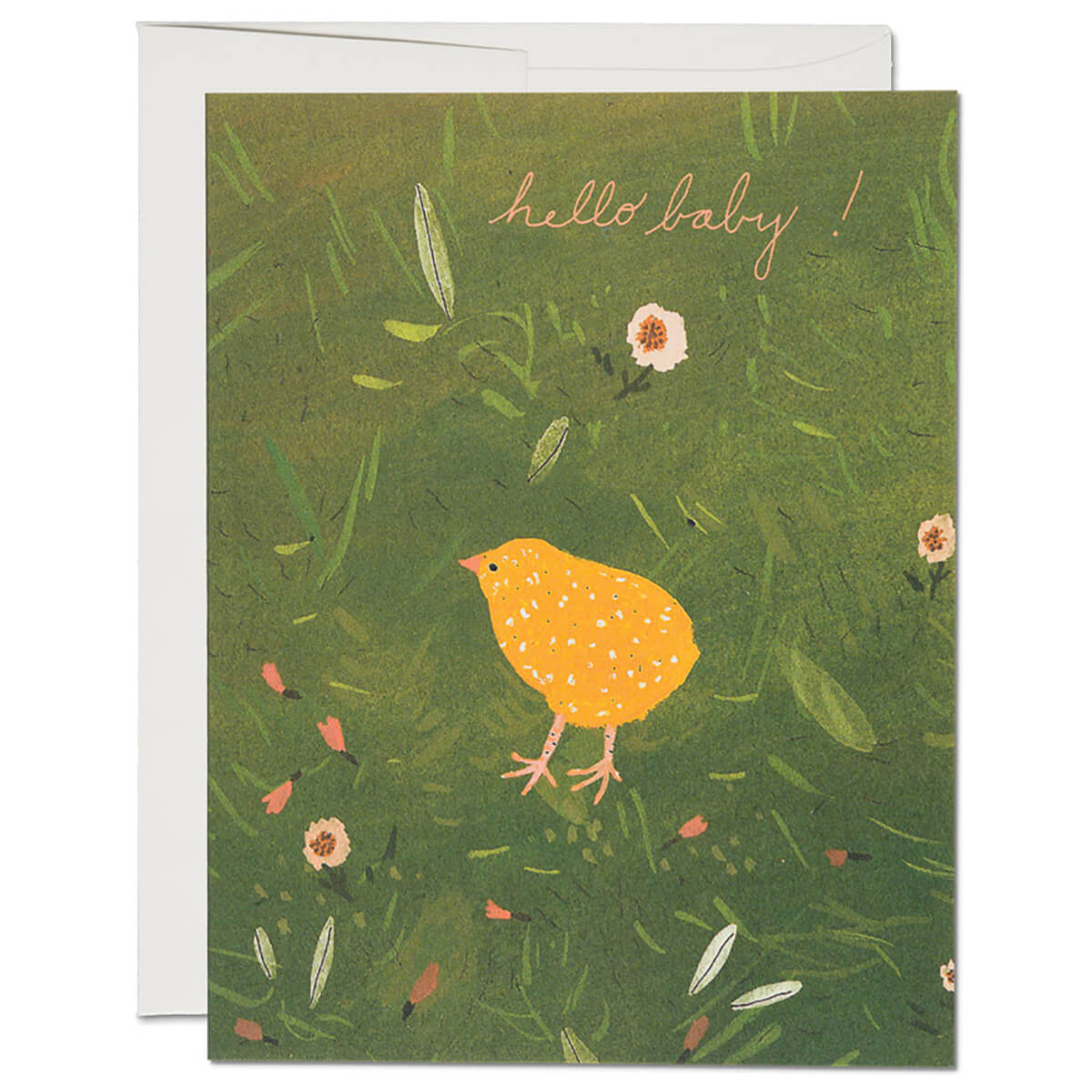 Baby Chick baby greetings card by Red Cap Cards. Features an illustration by Becca Stadtlander. Printed in the USA on heavyweight card stock. Blank inside with white envelope.