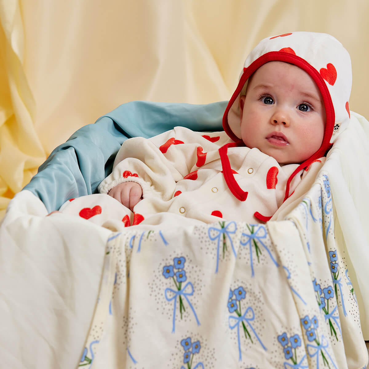 Hearts AOP Velour Baby Jumpsuit by Mini Rodini. Baby onesie in a soft and cosy velour, featuring an all over heart design.