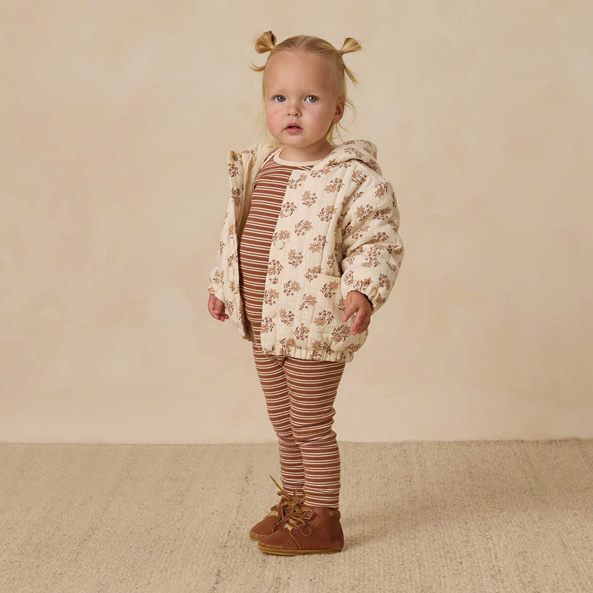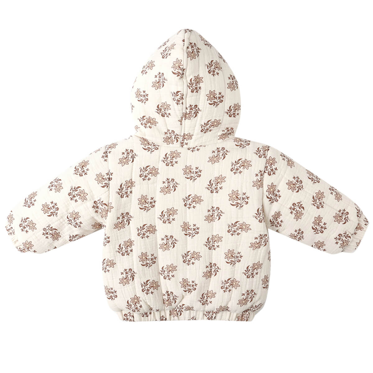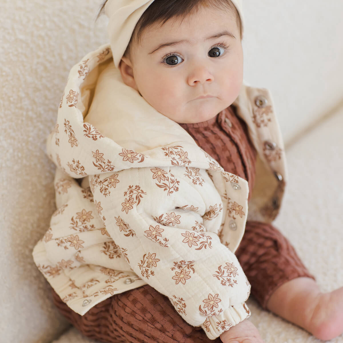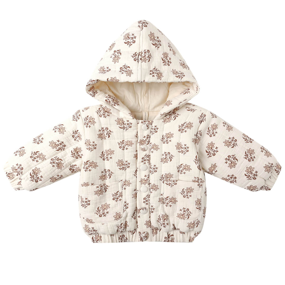 Hooded Woven Jacket by Quincy Mae. This cosy hooded woven jacket features front patch pockets, fabric covered snaps, elastic at the sleeves and waist for a snug fit, and a hood for the cooler days ahead.