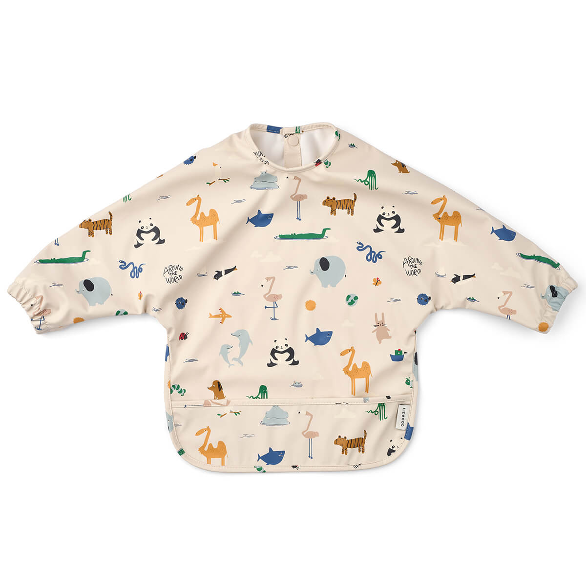 Merle printed cape bib by Liewood. A practical and water-repellent bib, lightweight and comfortable to wear with sleeves and a catch-all pocket at the bottom in order to protect the floor and clothes further. The bib can easily be wiped clean but also goes in the washing machine.