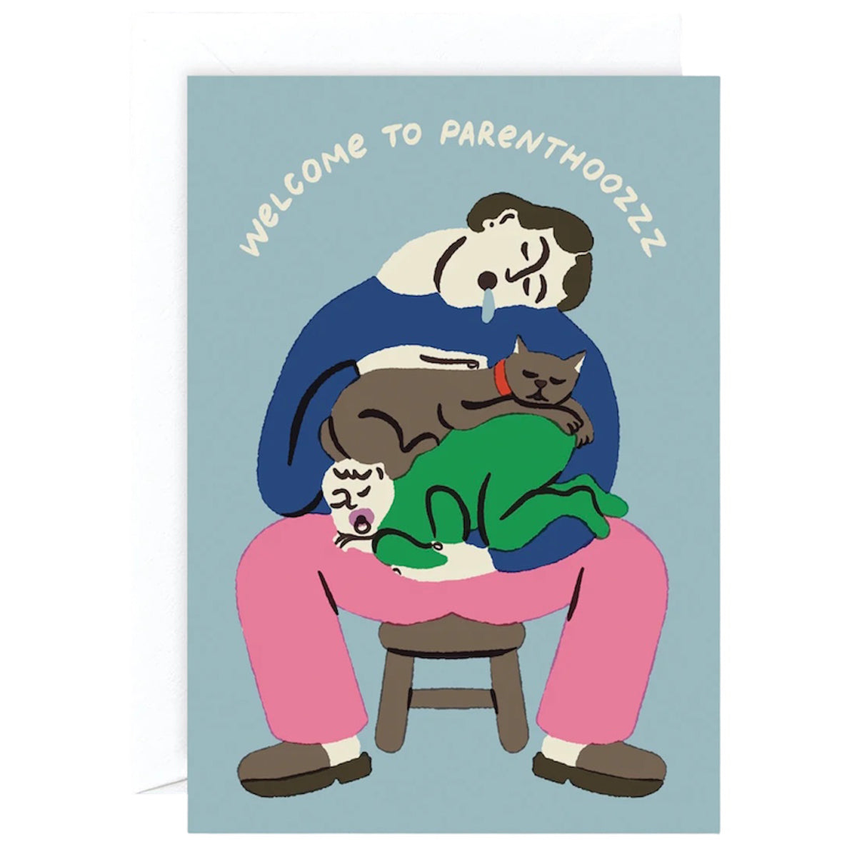 Welcome to Parenthood baby greetings card by Rozalina Burkova for Wrap. Sleep when the baby sleeps with this fun new parent card. Designed in a bright and lighthearted style by Bulgarian illustrator Rozalina Burkova. Blank inside with a coordinating green envelope.