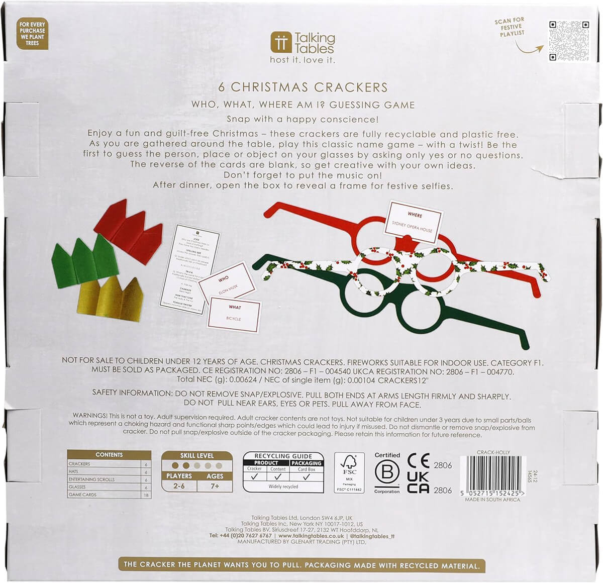 Botanical Holly Christmas Crackers by Talking Tables. Inside each cracker you’ll find a ‘Who, What, Where am I’ game, novelty glasses, game cards and of course a joke and paper crown.
