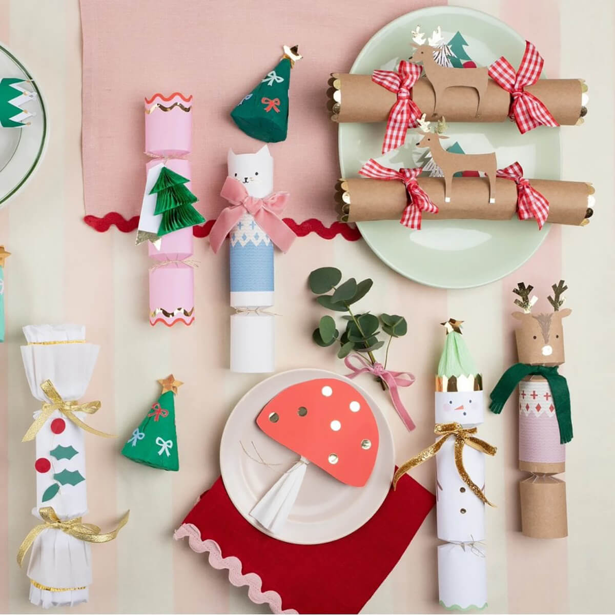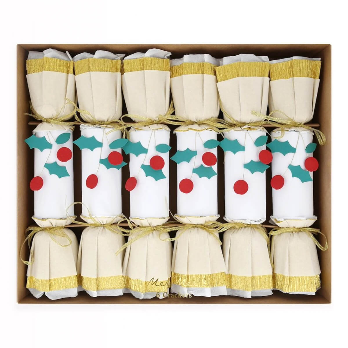 Holly Berry & Gold Crackers by Meri Meri. Gold ribbon bows, paper holly leaves and berries, and luxurious layers of crepe paper, make these crackers a beautiful addition to your festive table. Not only will they add a shimmering touch to your party table, but the superb contents will definitely delight your guests.