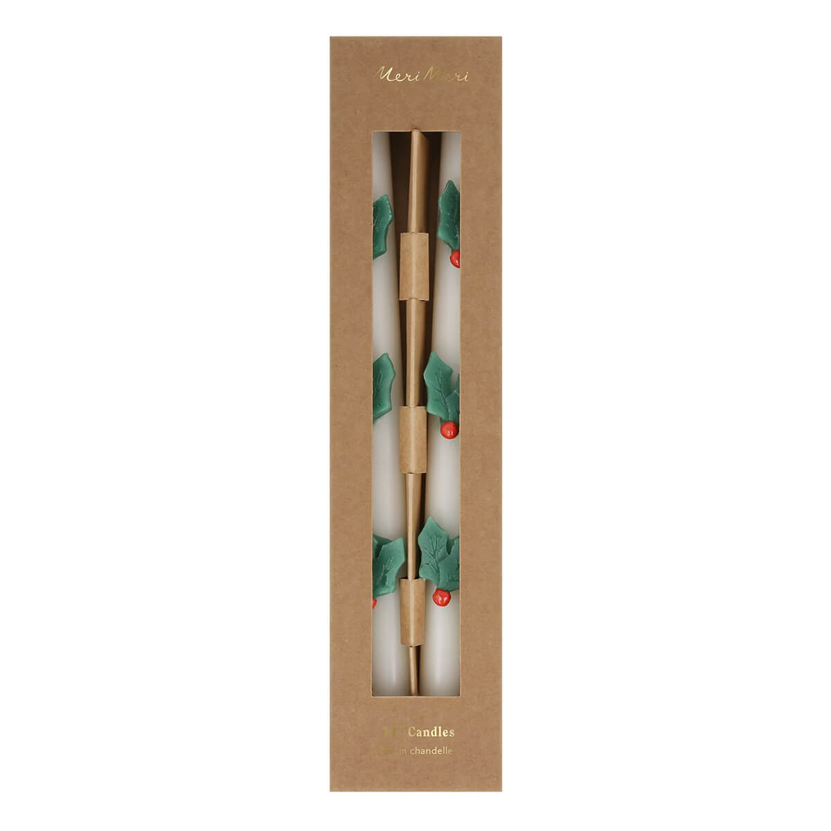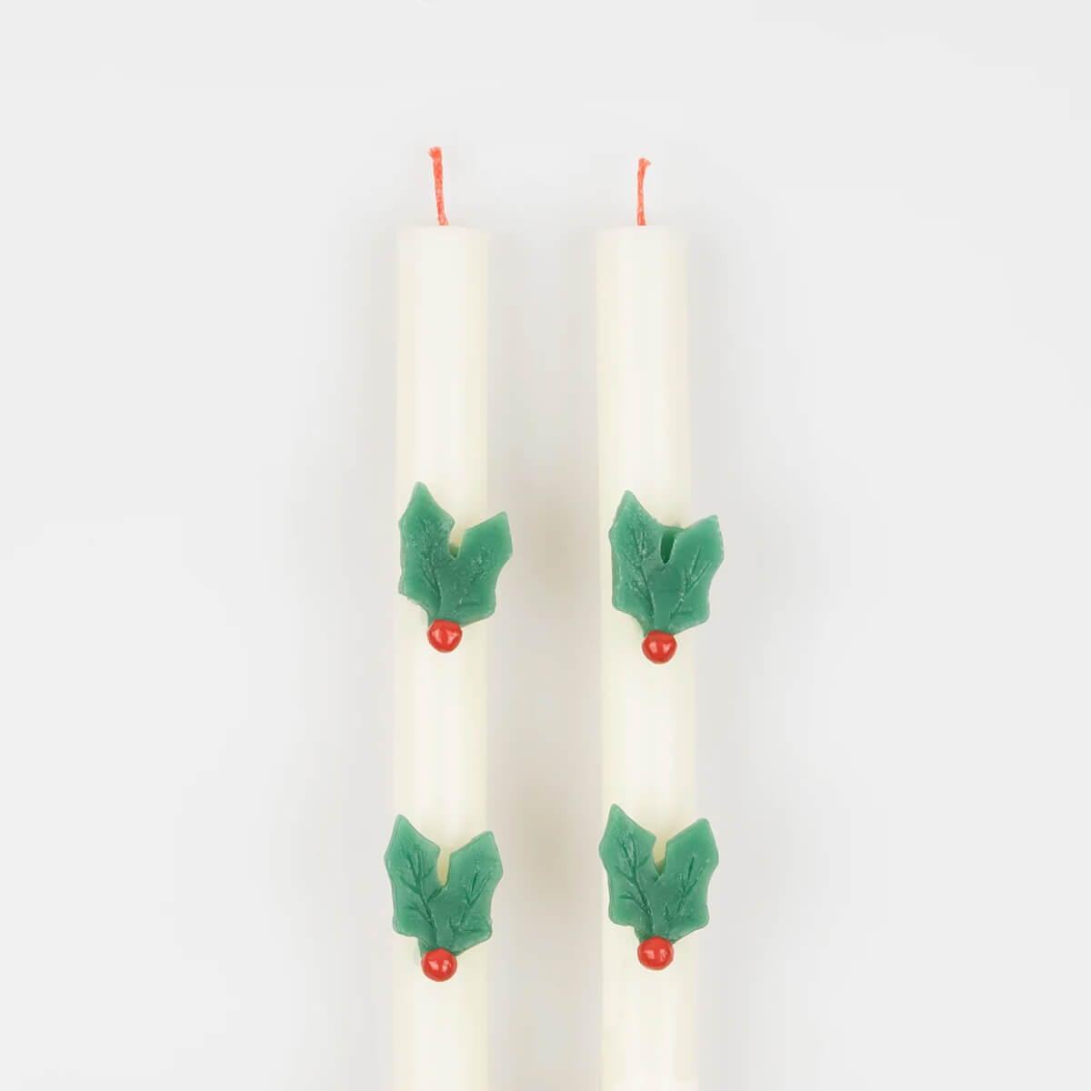 Holly Table Candles by Meri Meri. Elegant Christmas candles with wax holly details and coloured wicks.