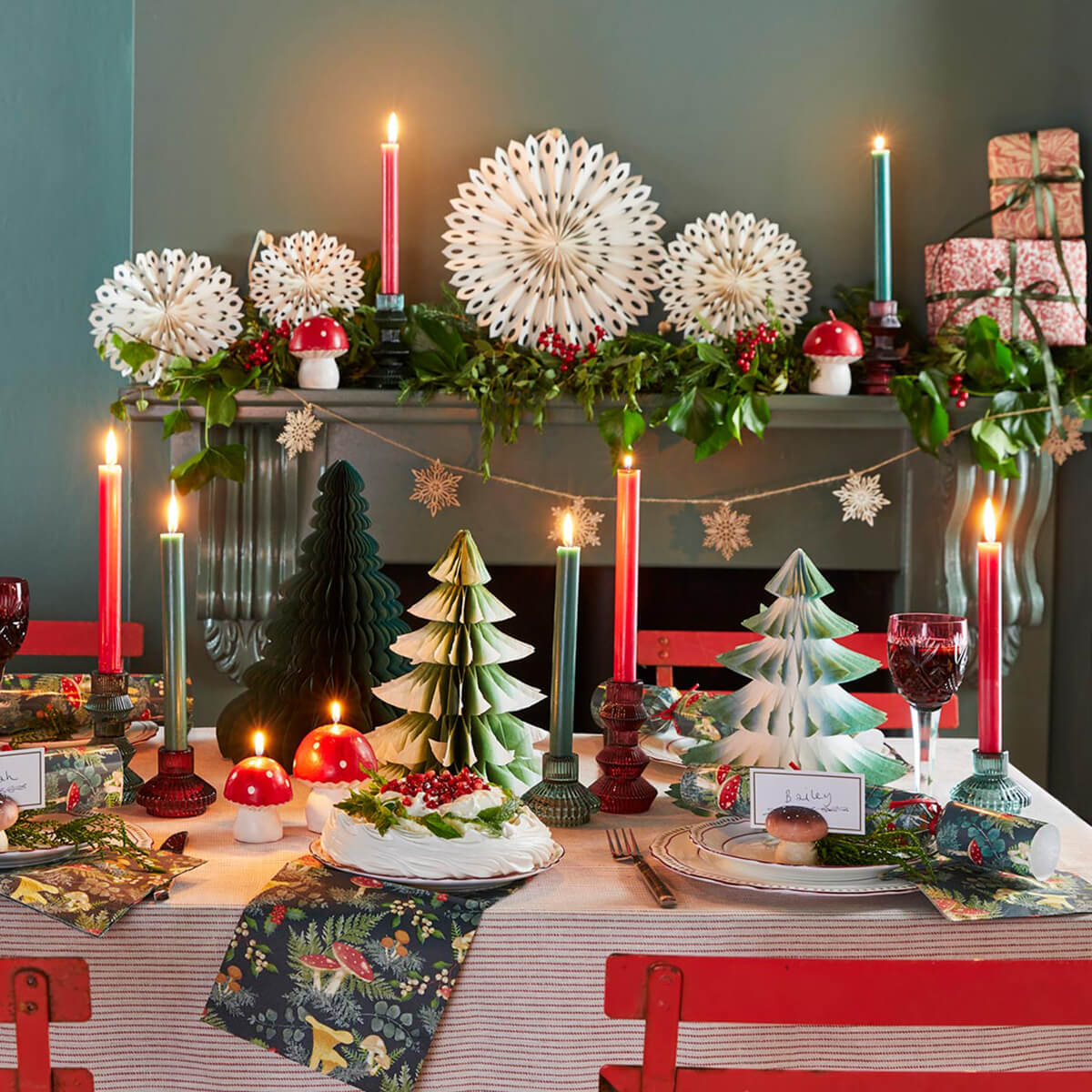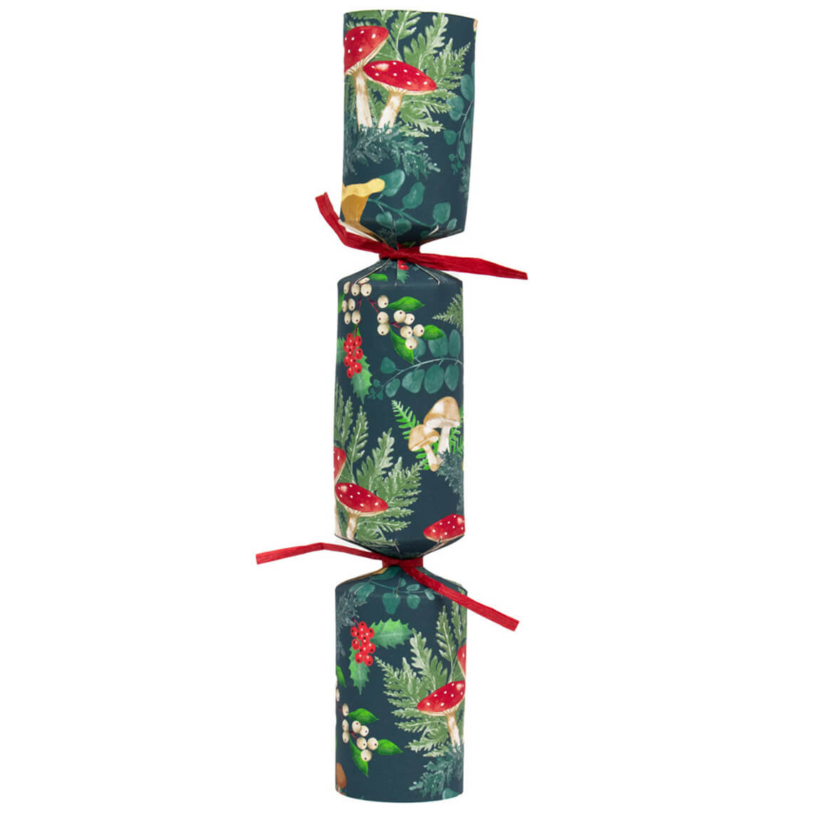 Midnight Forest Luxury Christmas Crackers by Talking Tables. A refresh on the traditional Christmas table setting, these eco-friendly Christmas crackers combine the classic rich greens and red of a traditional Christmas colour scheme with an on-trend winter mushrooms and toadstools design. Plastic free.