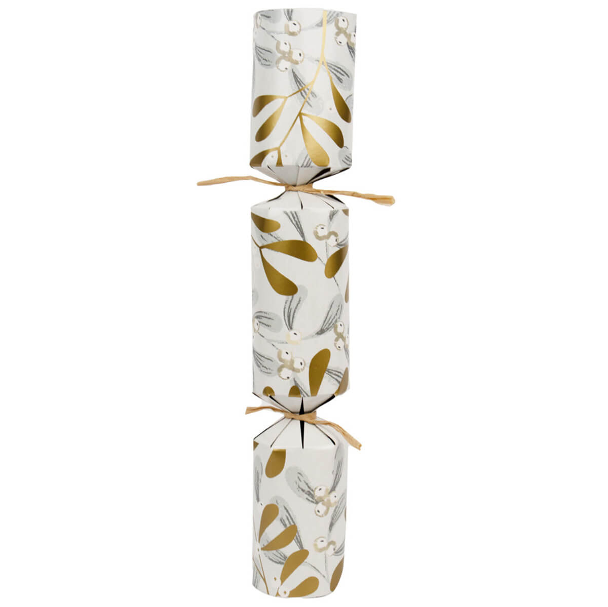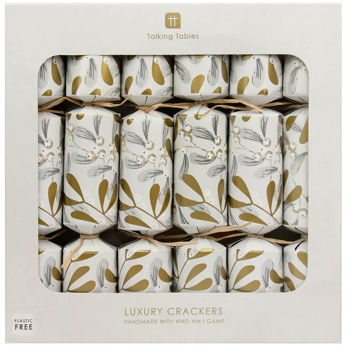 Mistletoe Christmas Crackers by Talking Tables. These traditional and luxury Christmas crackers are handmade and feature an elegant gold and silver mistletoe design. Each cracker contains a paper hat, joke, and origami frogs.
