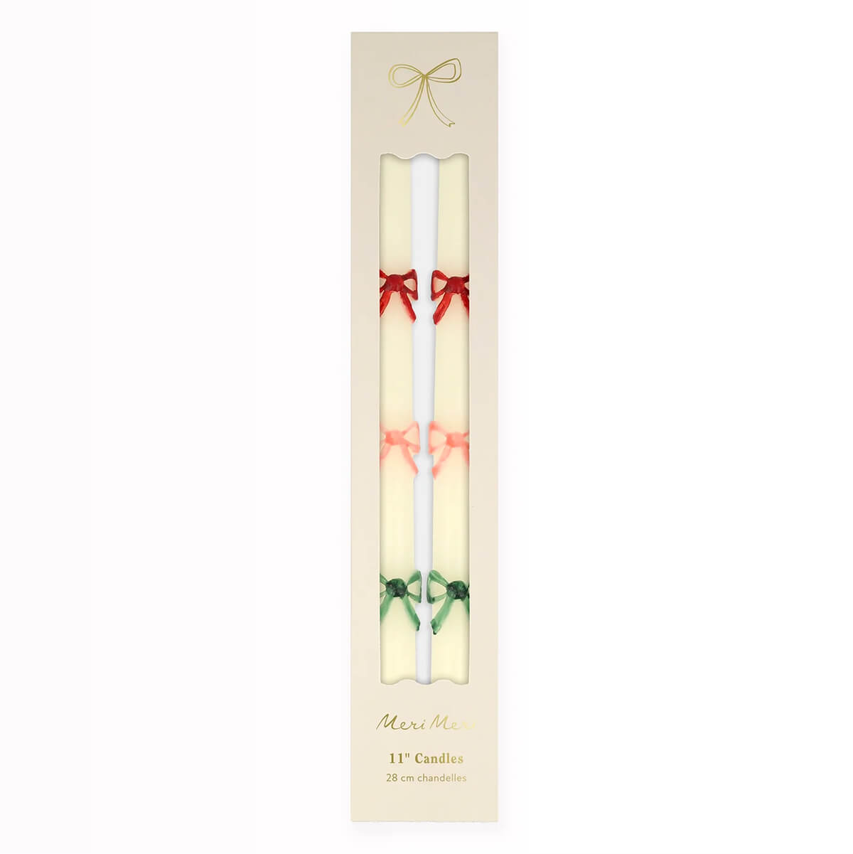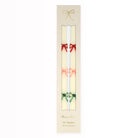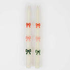 Multicolour Bow Taper Candles by Meri Meri. Ivory candles with hand-painted wax bow relief design in red, pink and green