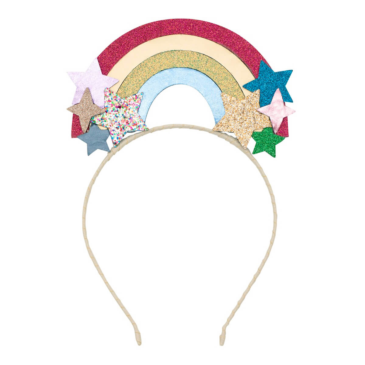 Glitter fabric ribbon wrapped alice band adorned with a brightly coloured oversized rainbow overlaid with eight shimmering stars, all crafted from a mix of glitter and metallic soft leatherette fabrics.
